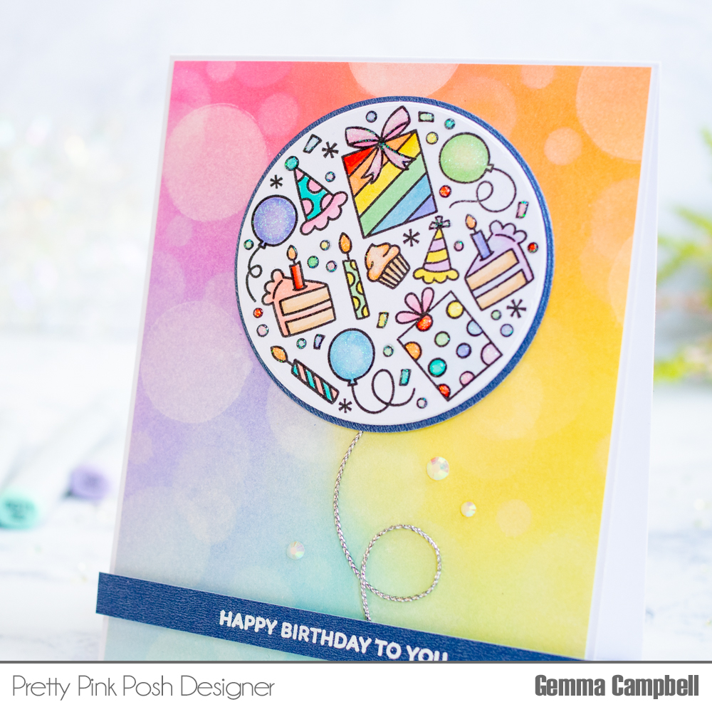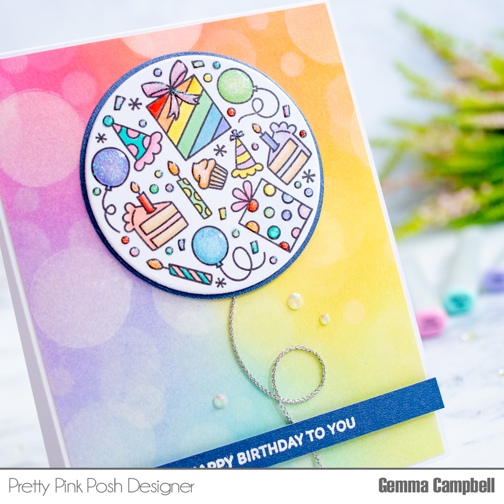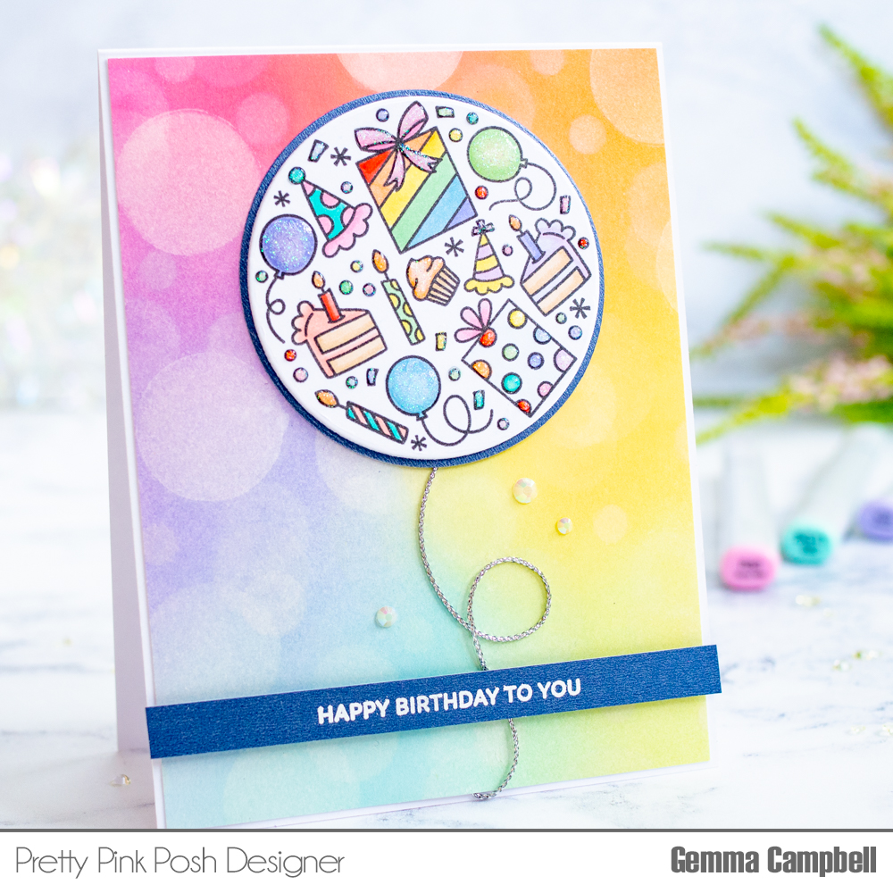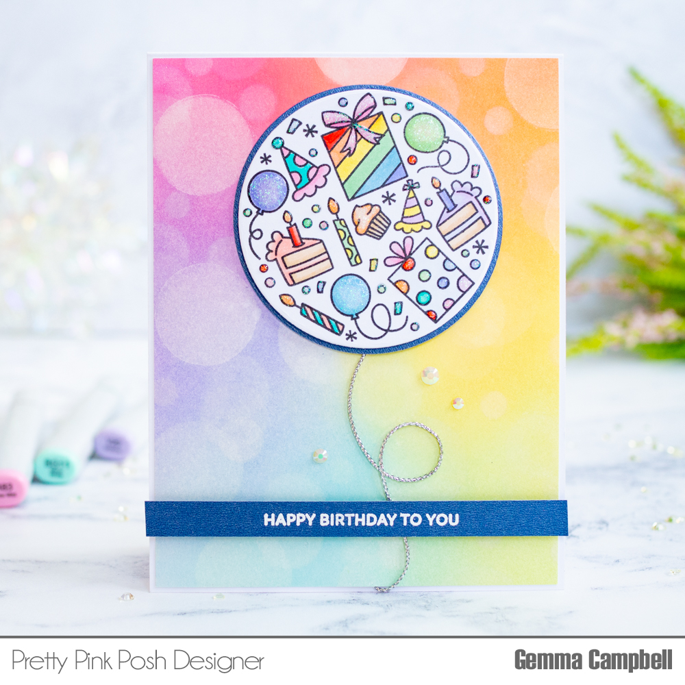 My card features the Let’s Party stamp set and the Layered Bokeh stencil set. I love the look of bokeh backgrounds, but hadn’t attempted to make one previously. These new stencils make it so easy to recreate this technique.