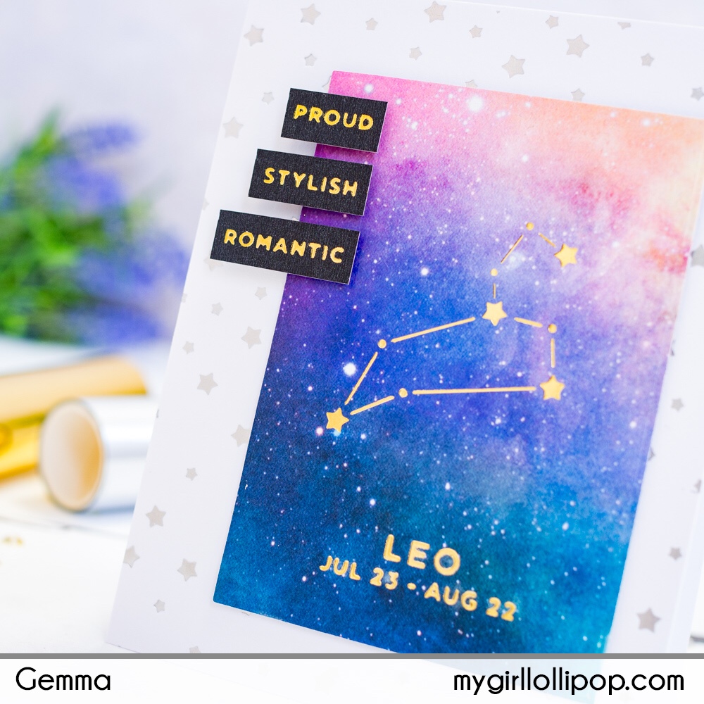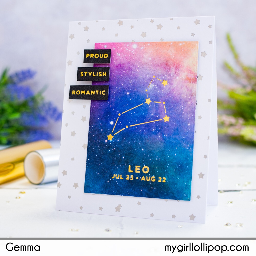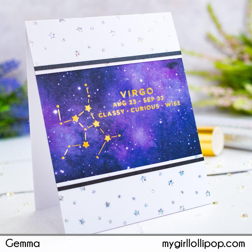 For my second card, I cut a panel of patterned paper and used gold foil to add all three glimmer plates for the Virgo zodiac sign. I adhered this panel onto my card base.