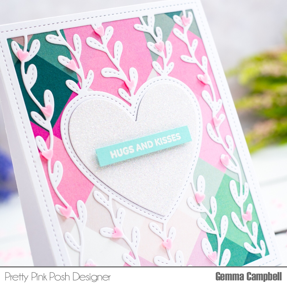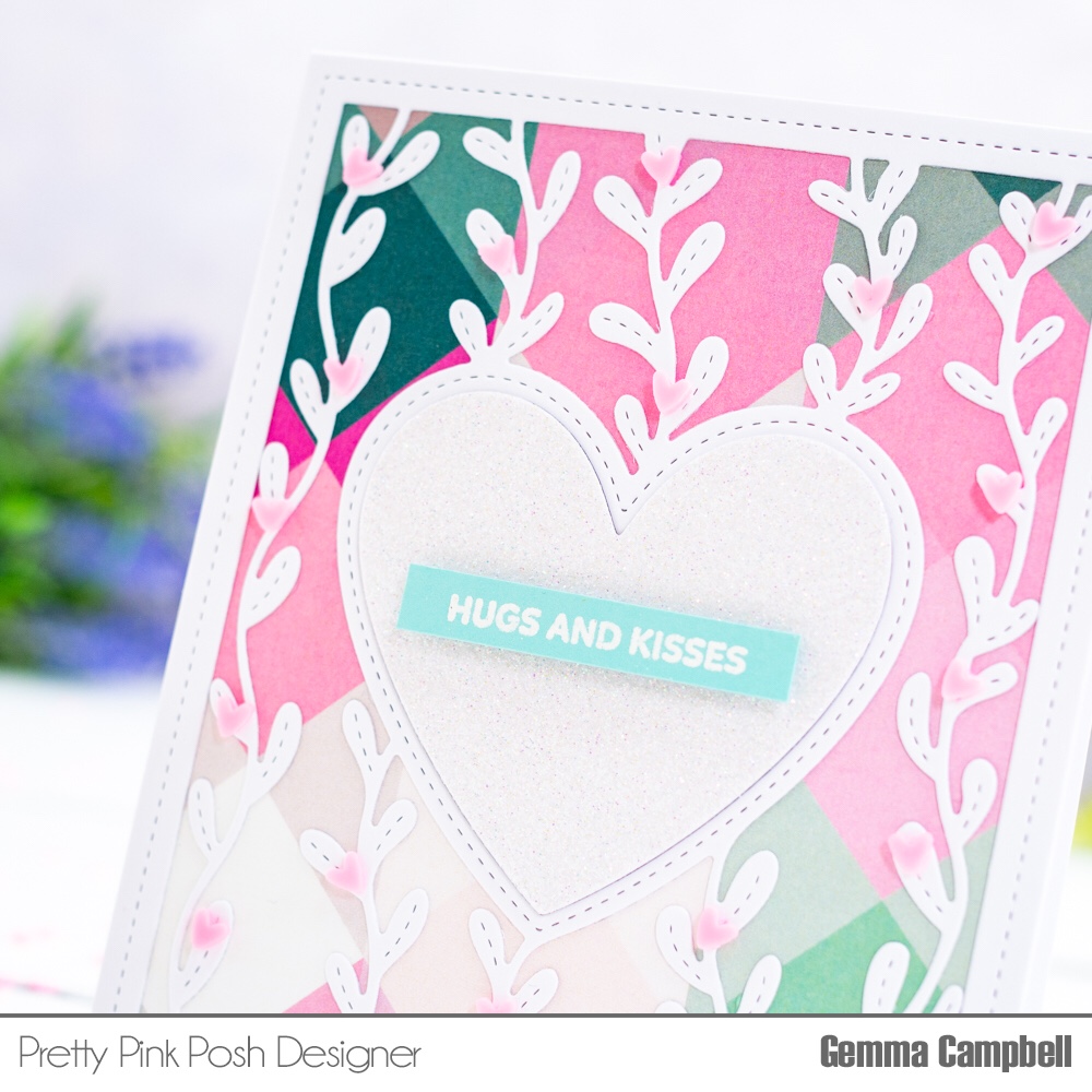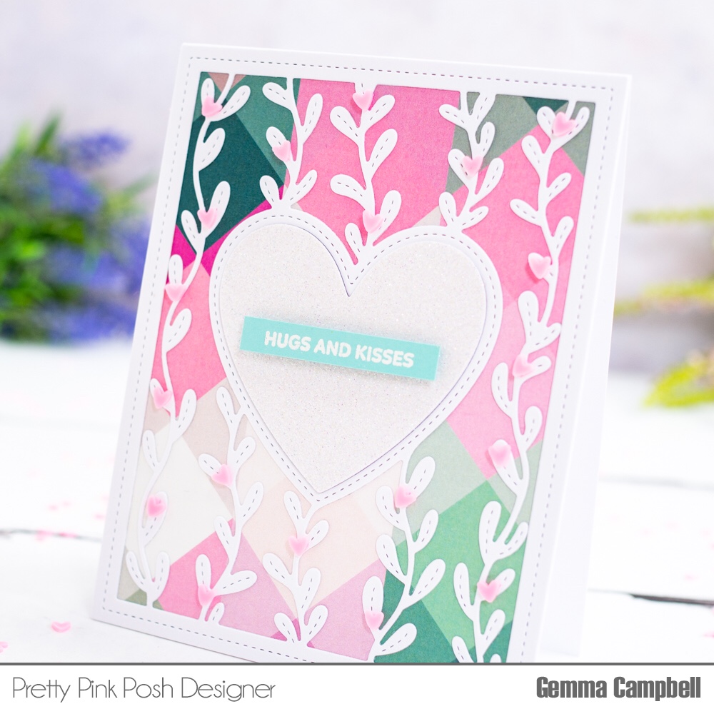 My card today features one of the most popular products from the Pretty Pink Posh January 2021 release. The Heart Vines die is a beautiful cover die, that fills an A2 card.