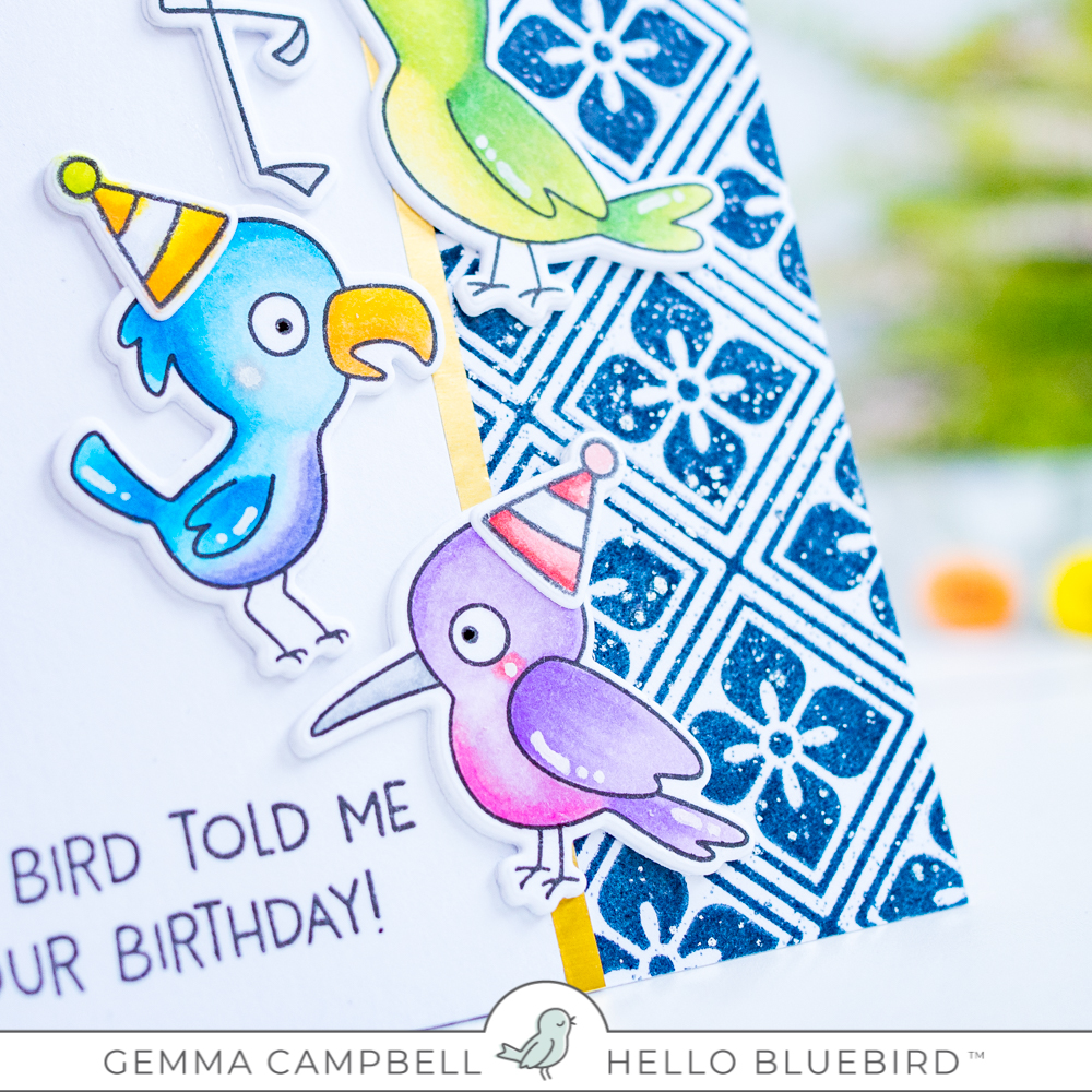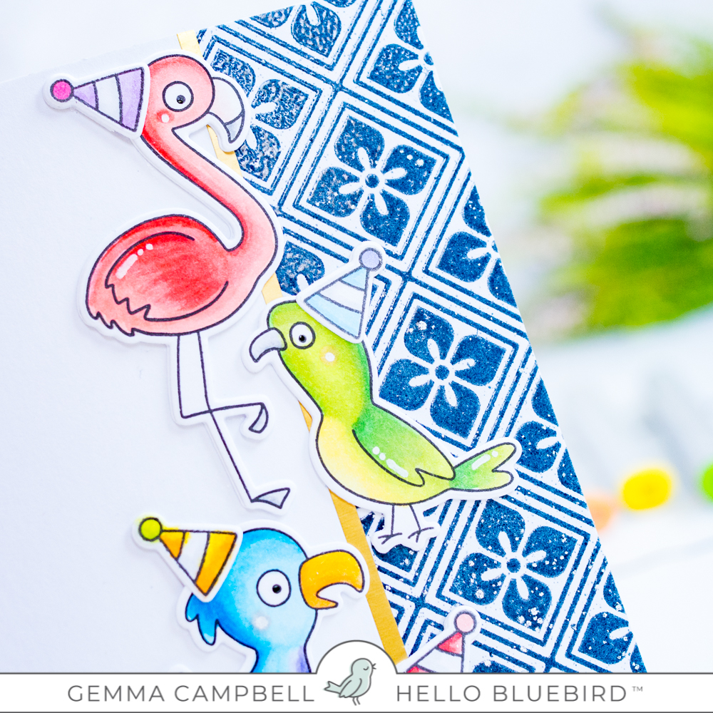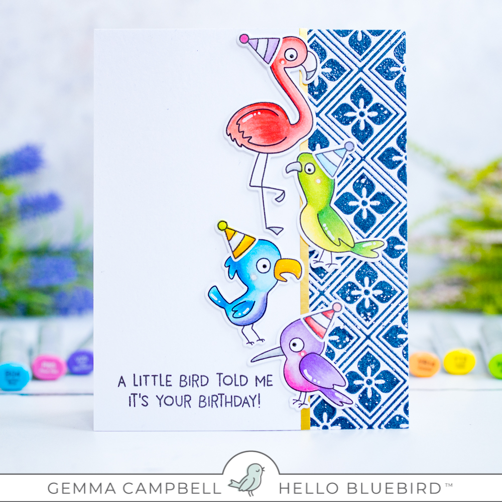My card today features another fun background stamp from Hello Bluebird. All the previous backgrounds are being re-released as clear stamps on March 4th. This release will include some brand new scenic background stamps too!