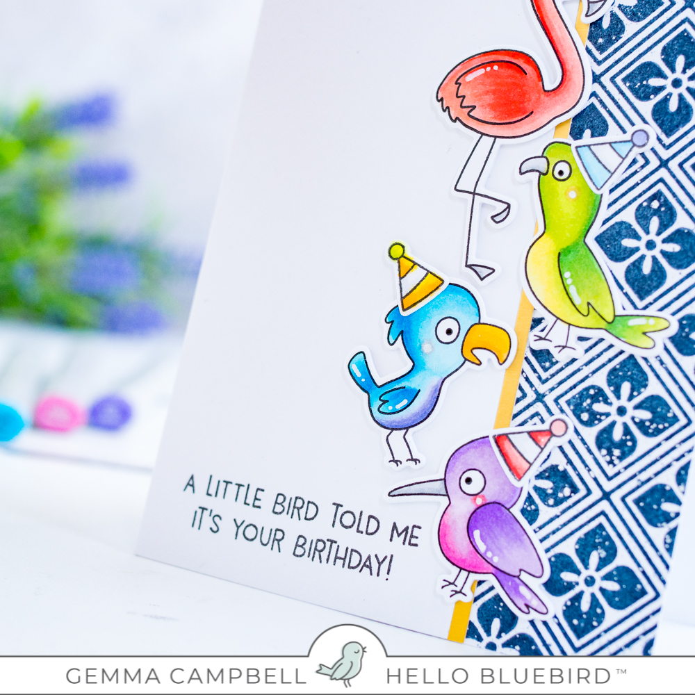 I stamped a sentiment from the Silly Birds stamp set on the left hand side, then adhered four birds with party hats onto the card to finish.