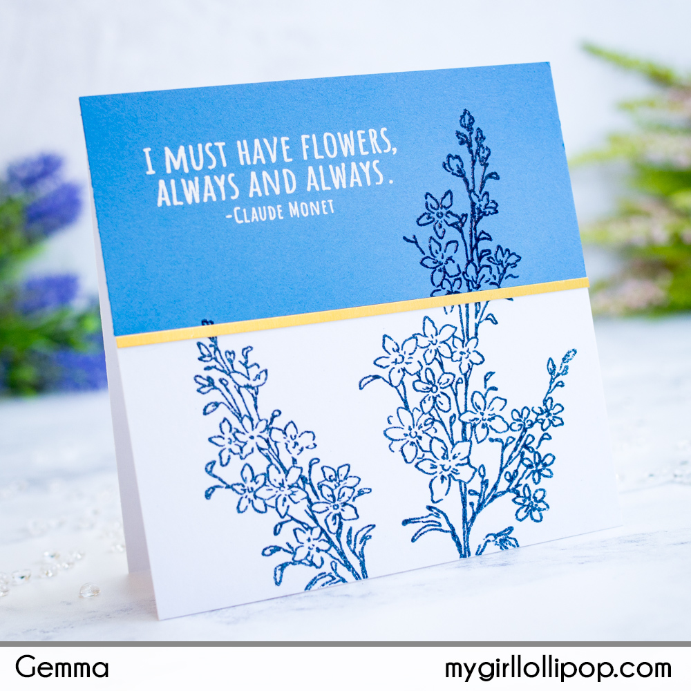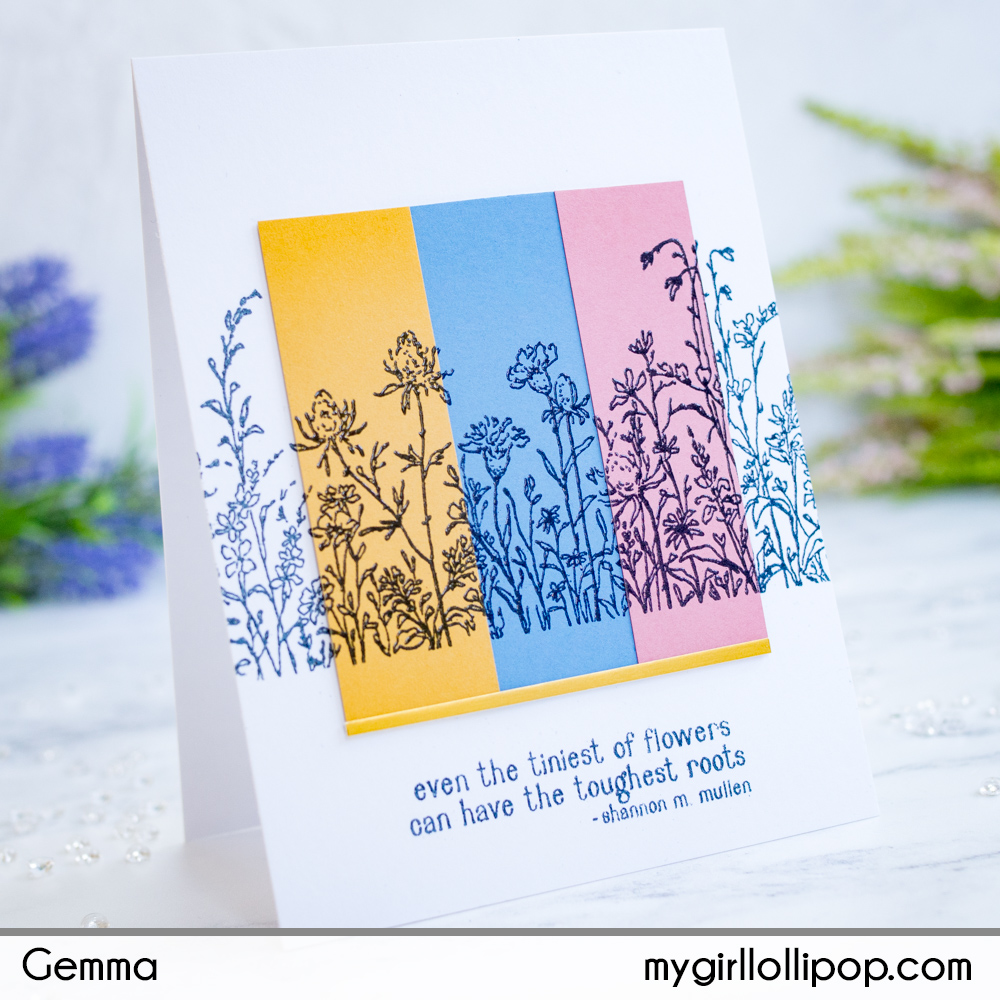 Under the main image on the white panel, I embossed in navy a sentiment from the Wildflower Sentiments stamp set. I then attached the panel to a card base.