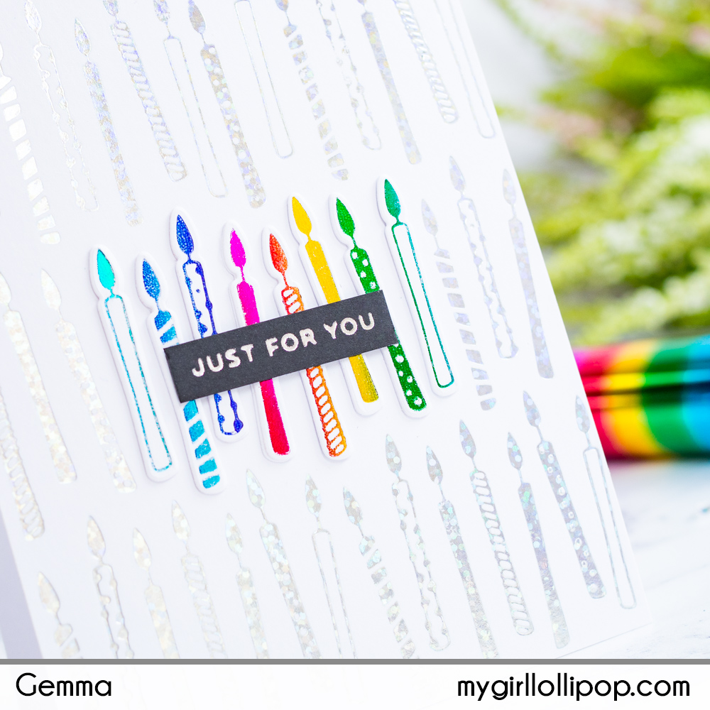 I foiled a sentiment from Yana’s Tiny Sentiments Glimmer set, on black card with silver foil. I trimmed it down and adhered over the rainbow candles to finish.