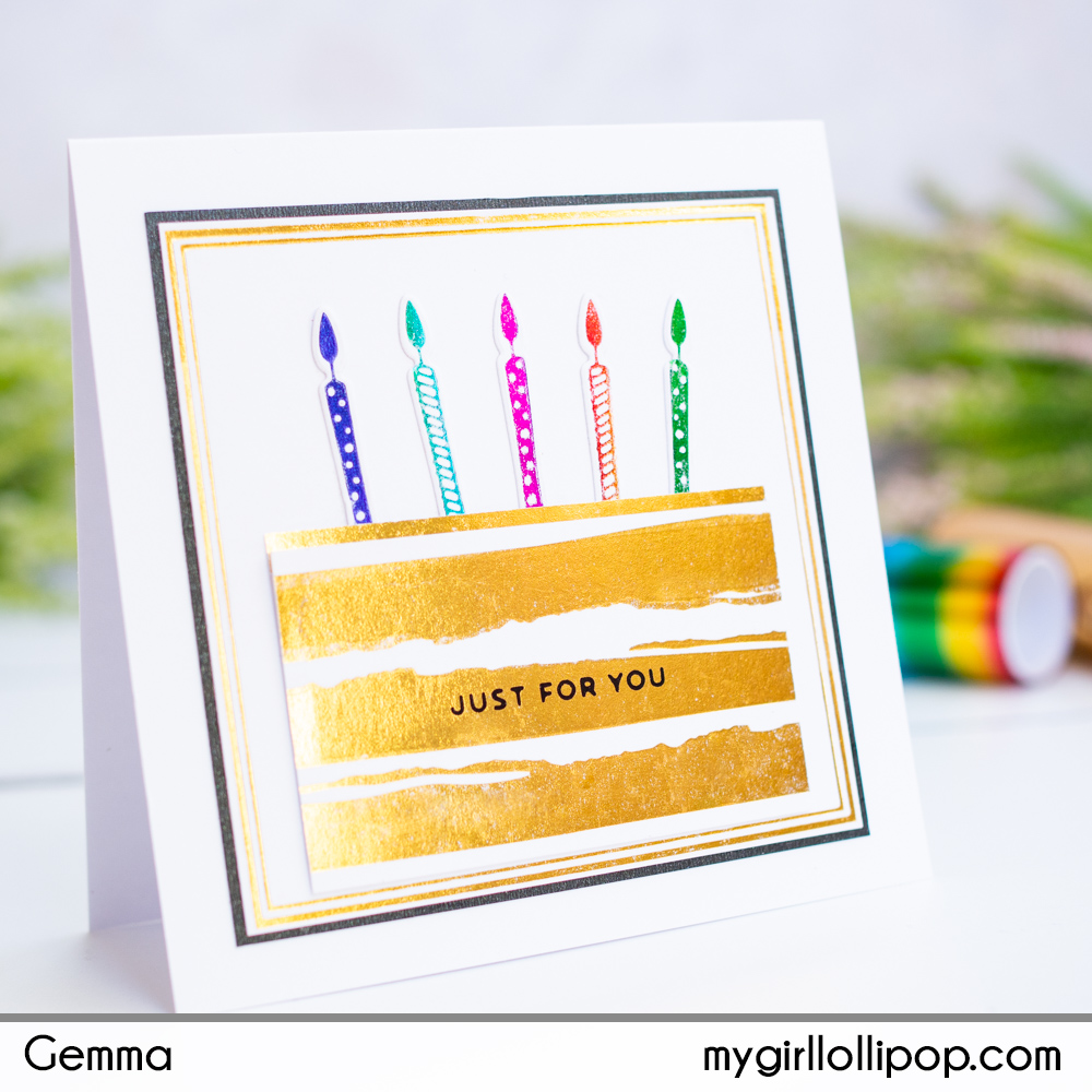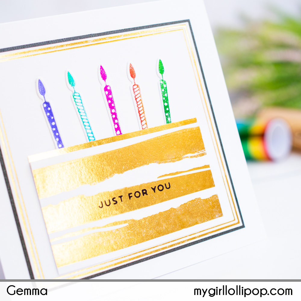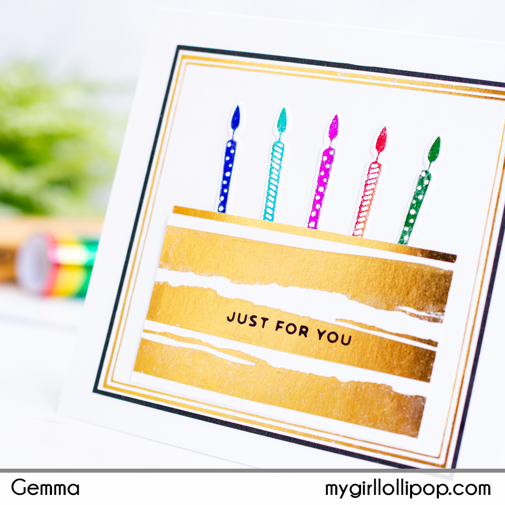 I had some foiled candles left over from another card, created using the Birthday Candle Background Glimmer set and Mini Rainbow Stripe foil. I adhered 5 candles on the top of the cake to finish.