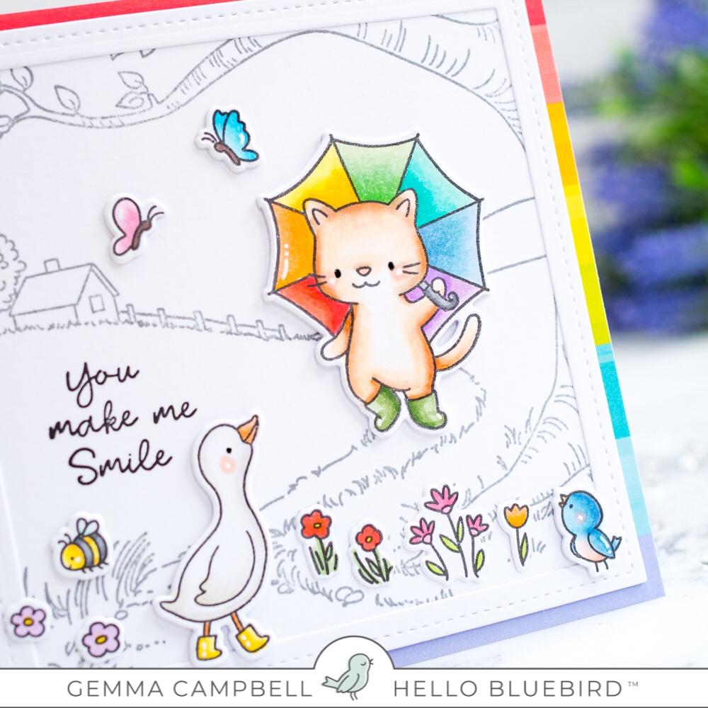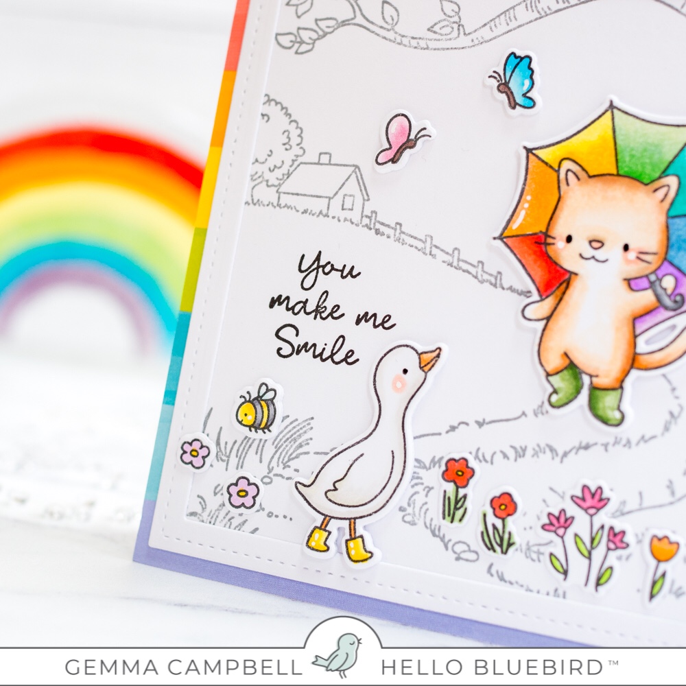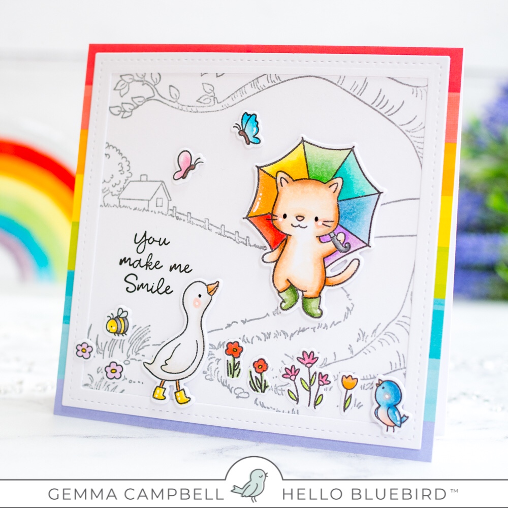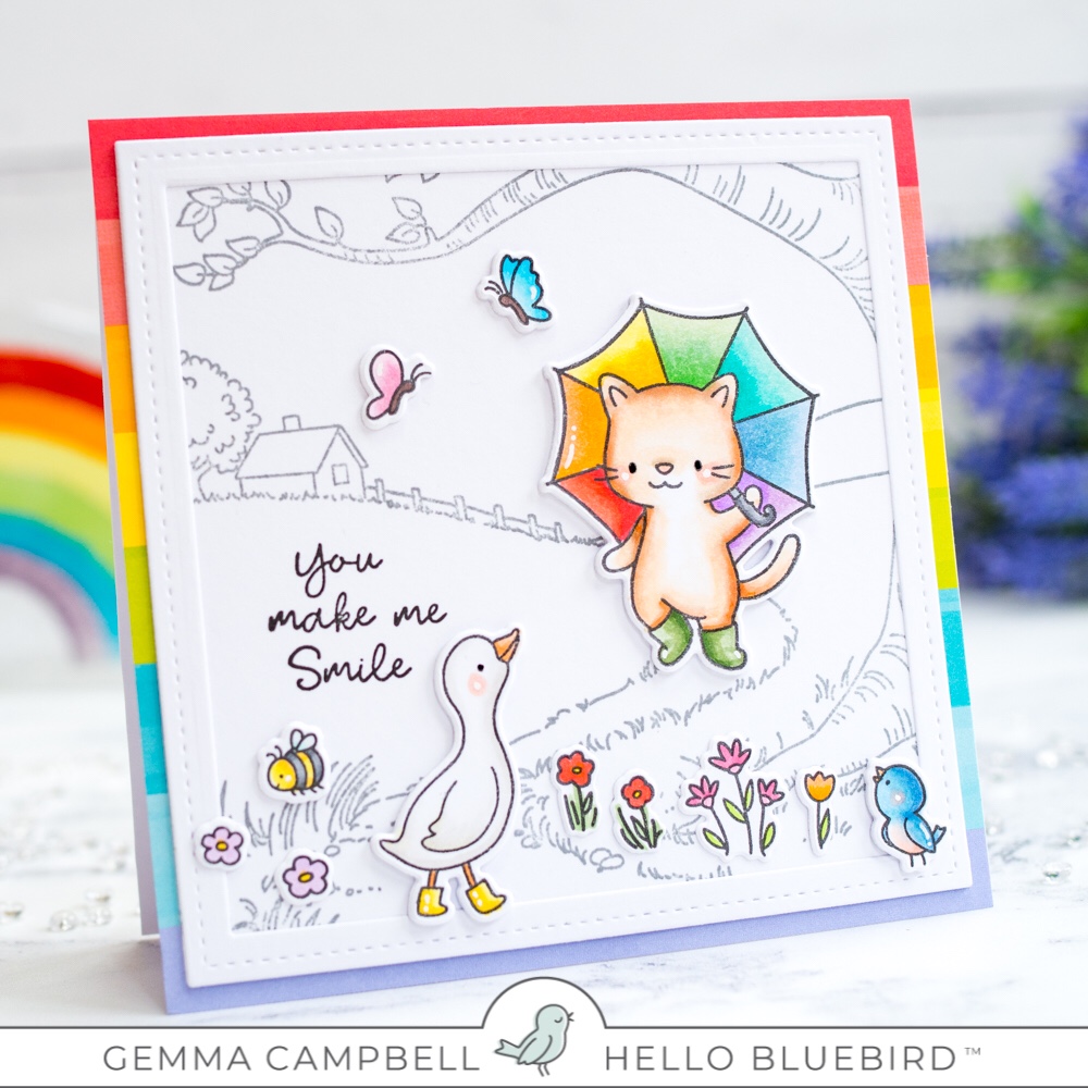 Today I’m using the new Rain or Shine stamp set from Hello Bluebird. I teamed it with the Country Roads background and added some rainbow pops of colour.