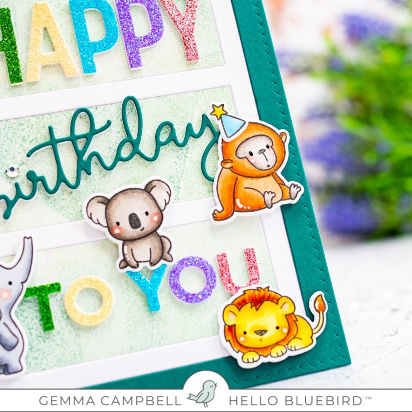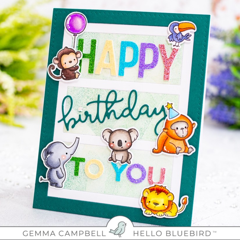 I die cut the Happy Birthday Words die from glitter card, layering some white die cut layers behind for dimension. I arranged these on the card and adhered with liquid glue. A jewel is a nice touch of sparkle for the dot on the birthday letter ‘I’.