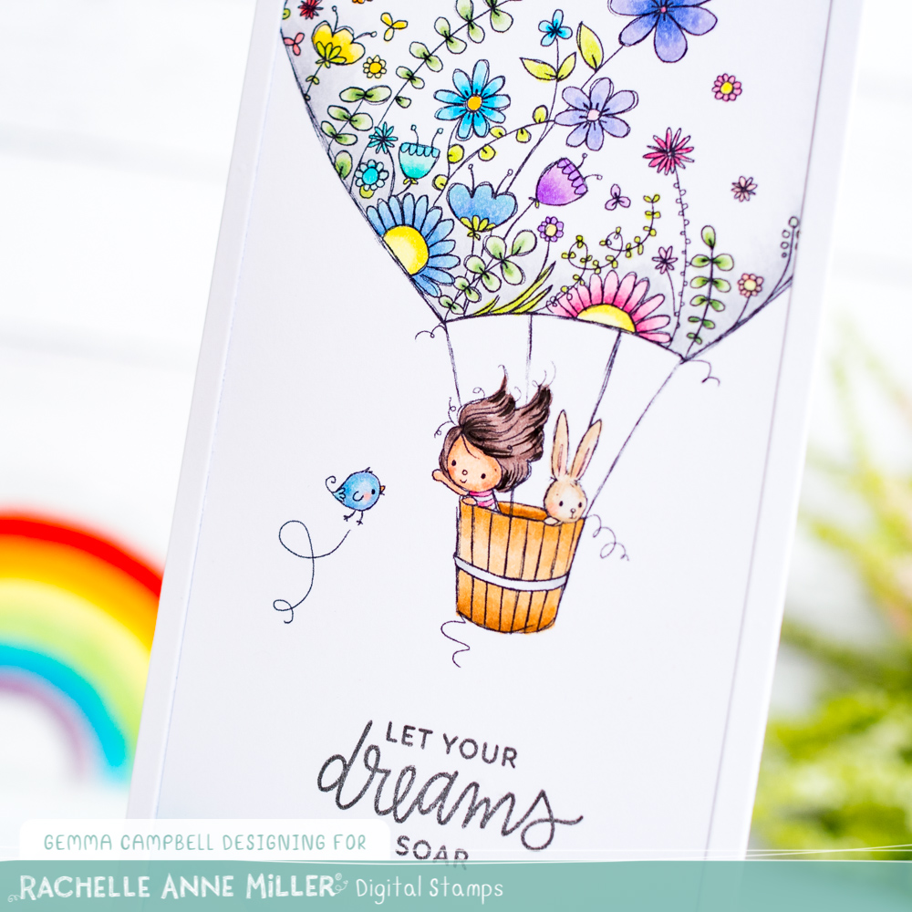 Today I have a sneak peek to share of a soon to be released digi stamp from Rachelle Anne Miller. This sweet Hot Air Balloon image is part of a 4 stamp digi release arriving on Thursday 10th June.