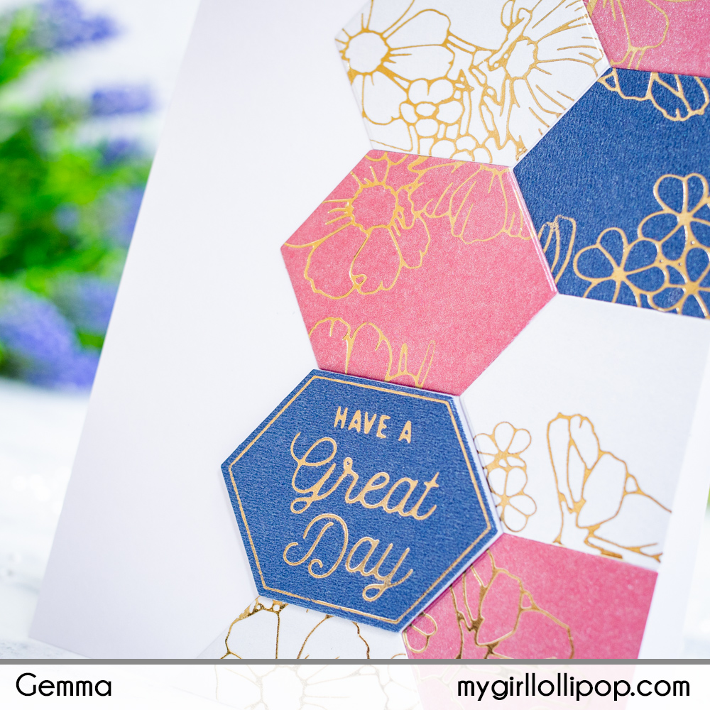 I also foiled the sentiment and hexagon border on navy pearlescent card, using champagne foil.