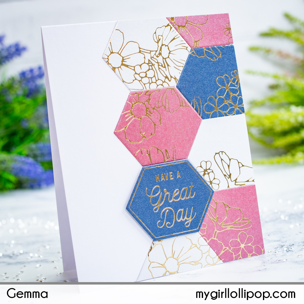 I was inspired by the hexagon die in the kit to make a floral quilt style pattern on my card.