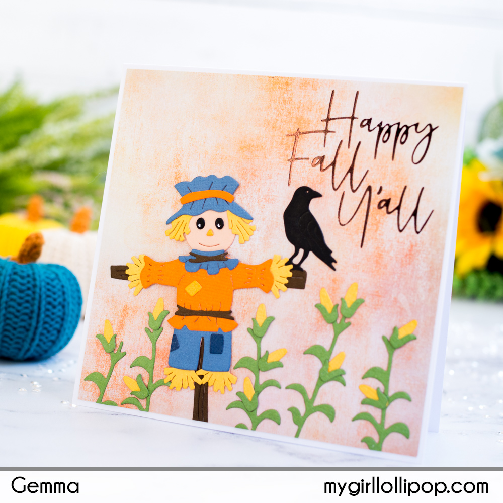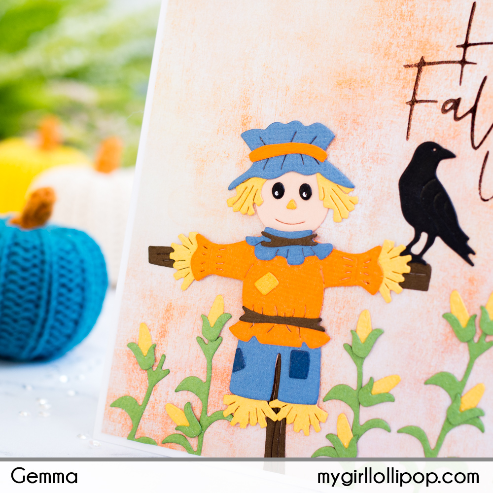 I’m using the Scare a Crow set on my card today. This 17 piece die set has a scarecrow, crow, corn and a pumpkin.