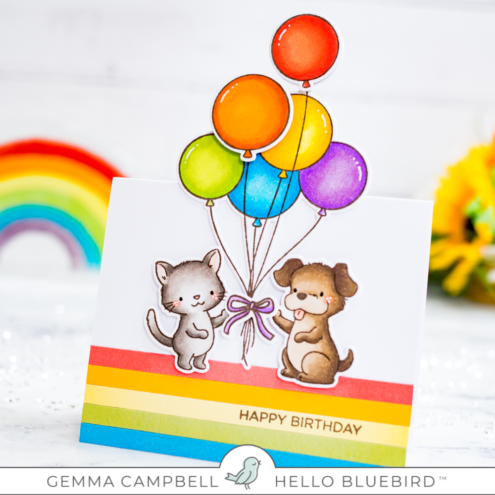 I coloured all the images with copic markers and die cut with the coordinating dies. I added a blank die cut layer behind the balloons, so the copic colouring couldn’t be seen from the back. I adhered the balloons to the card base, then added a couple more balloons on top with foam tape, for extra dimension.