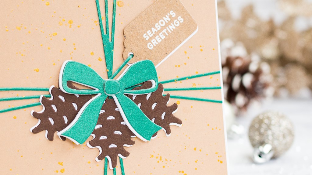 I love the look of traditionally wrapped Christmas presents, using Kraft paper and decorated with ribbon and pine cones. I had a go at recreating this look as a card.