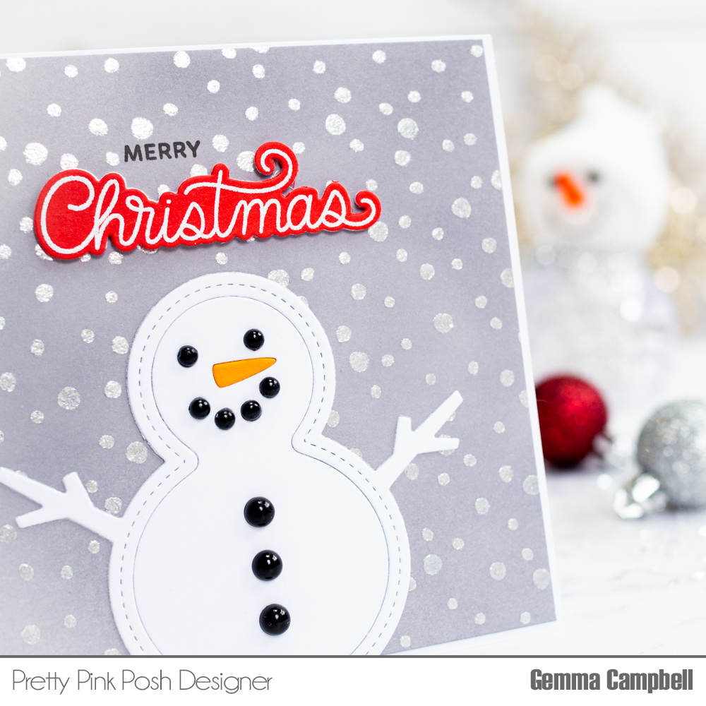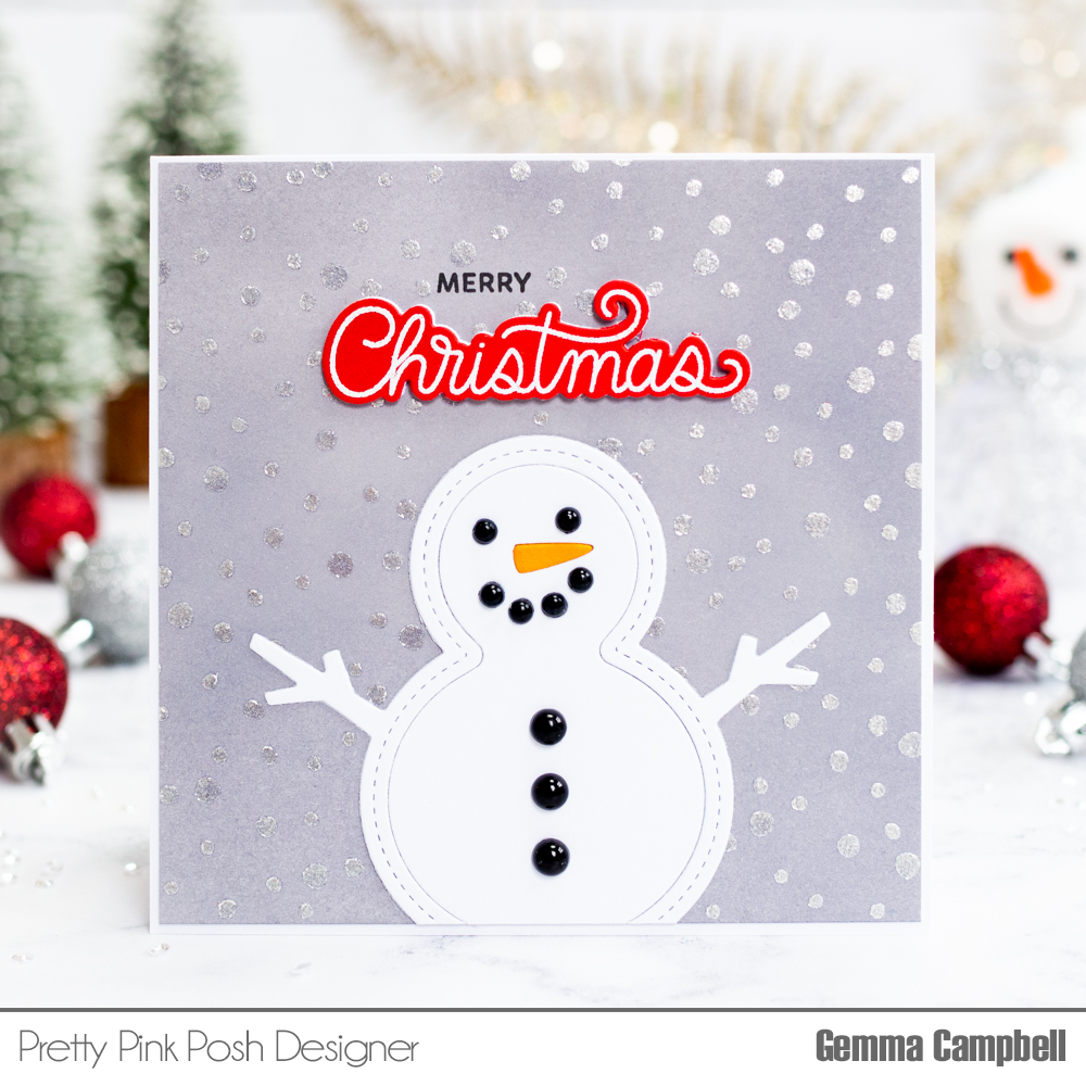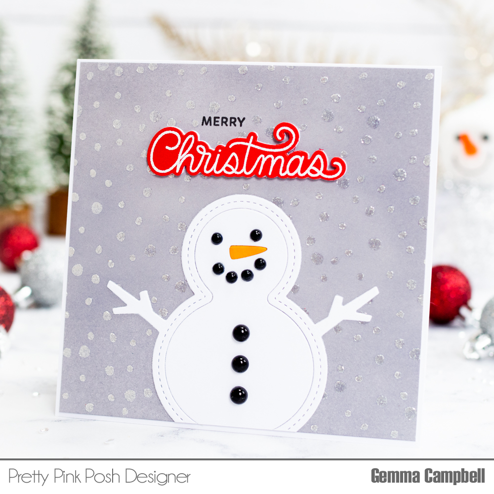 I die cut the Pretty Pink Posh Snowman Shaker die from white card, using the dies in the set to cut the face and button holes. I also die cut an orange card nose, layered twice for dimension.