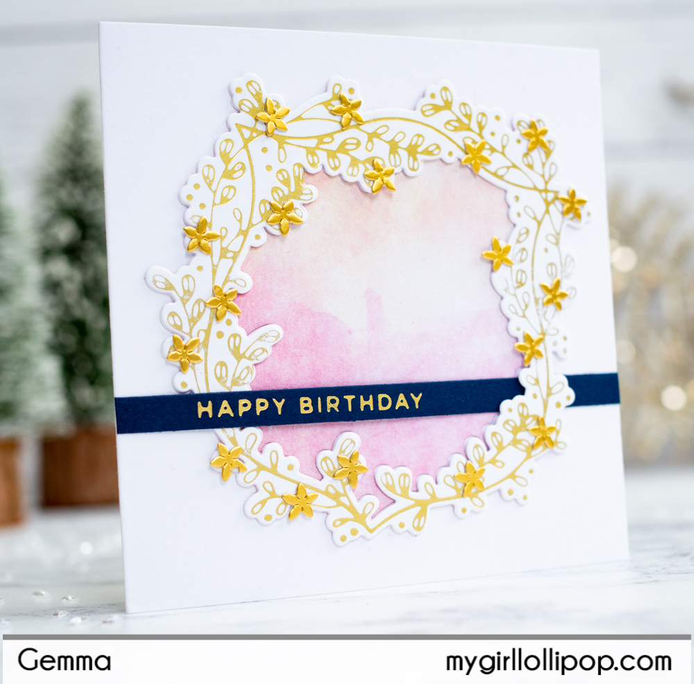 Included in the kit are two glimmer plate sentiments, but I decided to use a sentiment from a different set, as I wanted a banner style. I foiled a happy birthday sentiment from the Mini Everyday Sentiments set, with the same Matte Gold glimmer foil, on dark blue card. I used the coordinating die to cut it out.