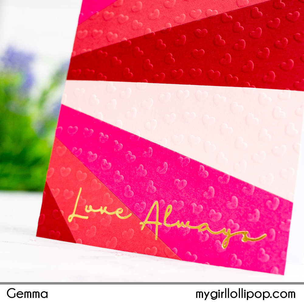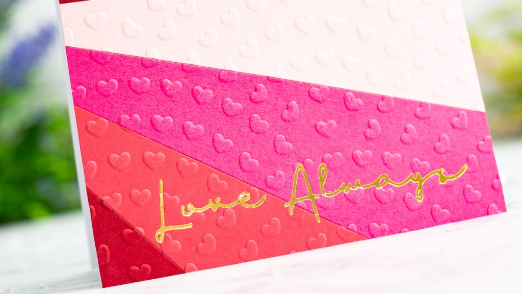 For a sentiment, I thought I’d try foiling over the embossed pattern. I found a lovely hot foil plate in the Essential Glimmer Sentiments set (available separately), foiling it in gold. It worked really well over the embossed detail.