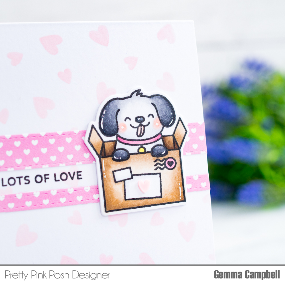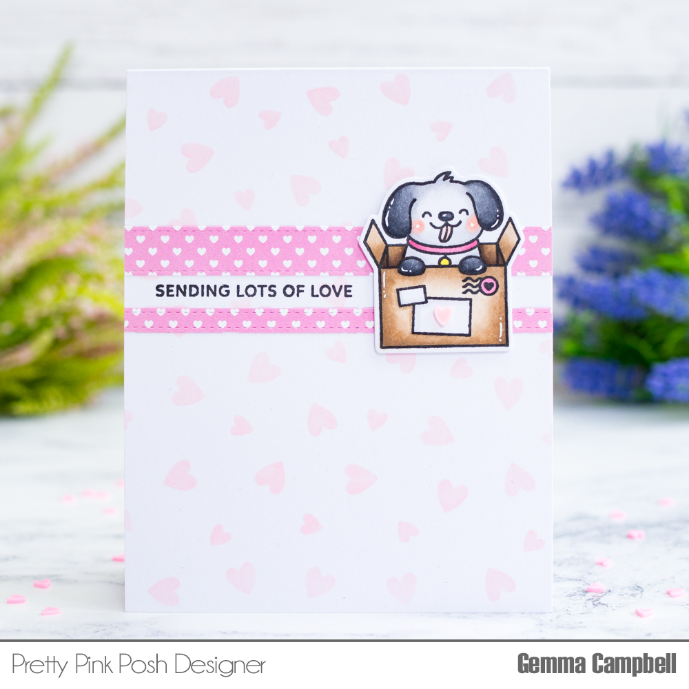 Today I’m sharing a card with the new Sending Love stamp set from Pretty Pink Posh. I’ve teamed it with the new Scattered Hearts stencil.