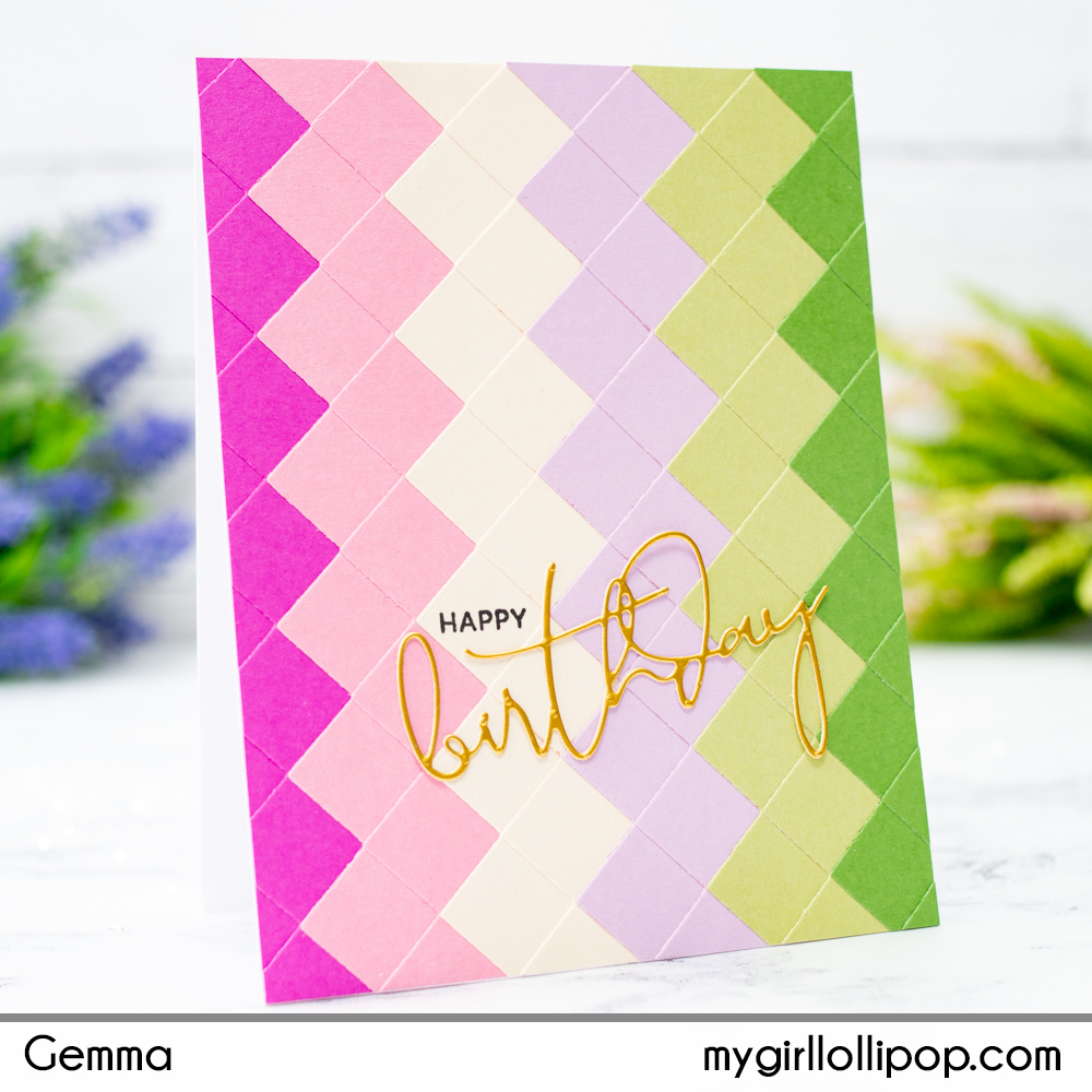 I decided to keep the sentiment simple and allow the background to be the focus. I chose a birthday greeting from Yana’s Layered Script Sentiments Etched Die set. I die cut it from metallic gold card, using stick it adhesive behind to make it easier to adhere to my card.