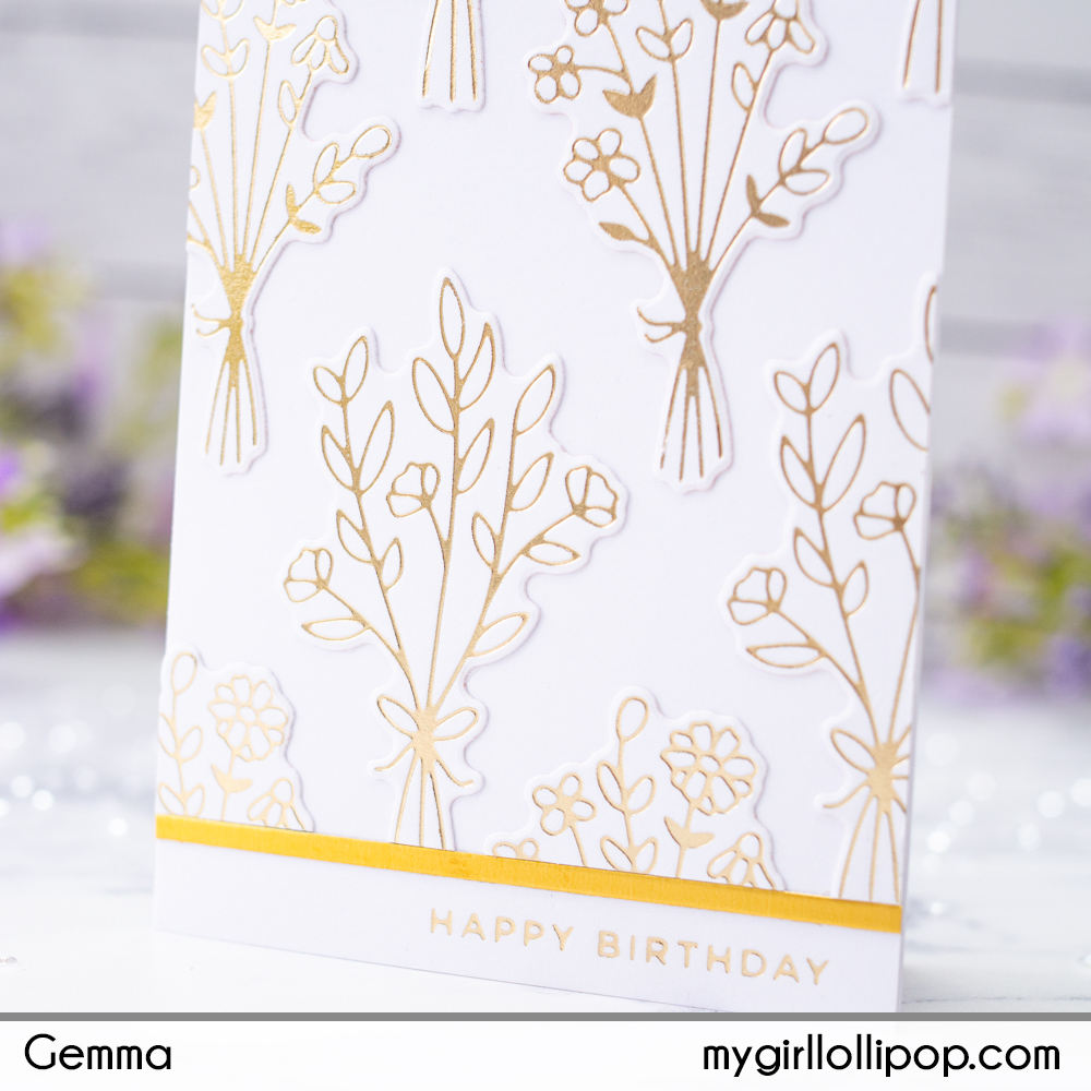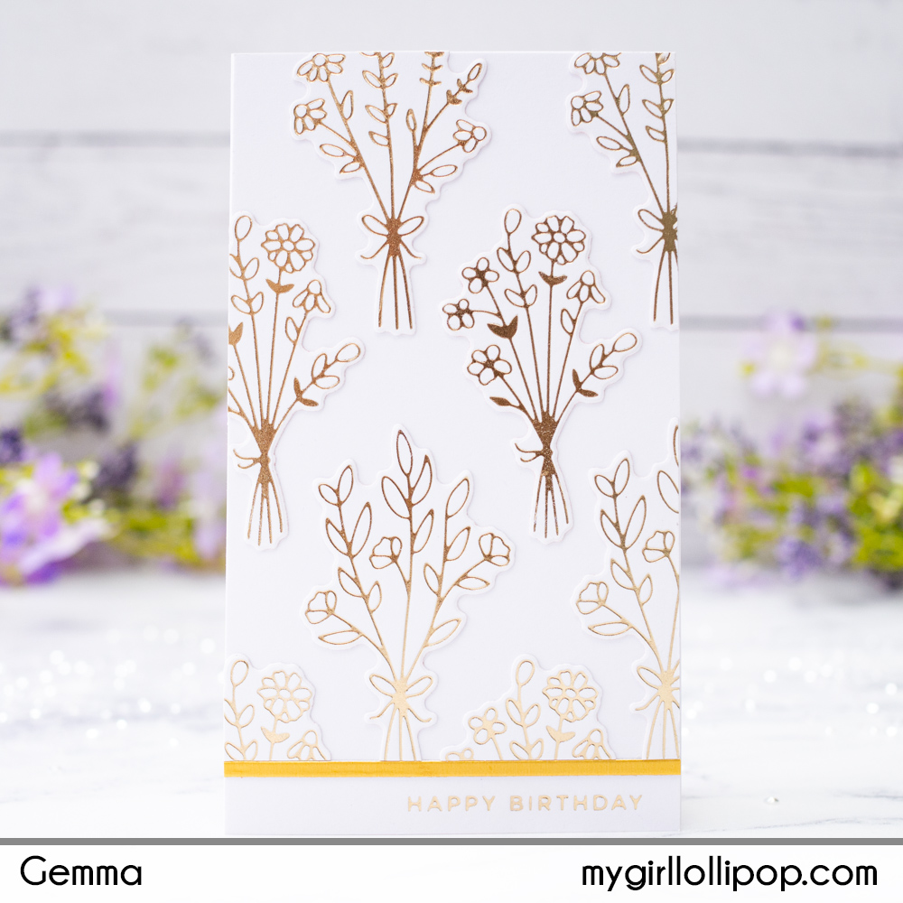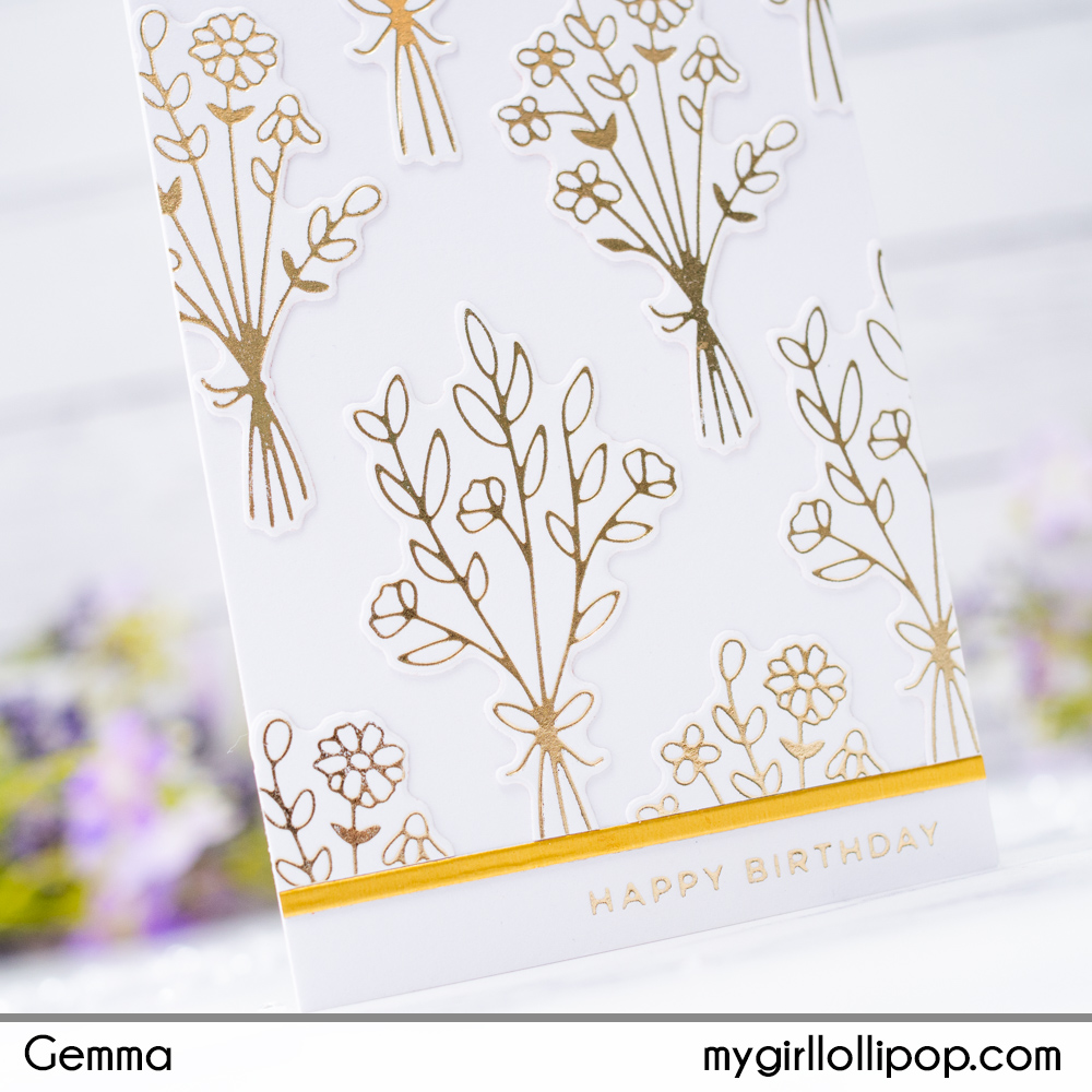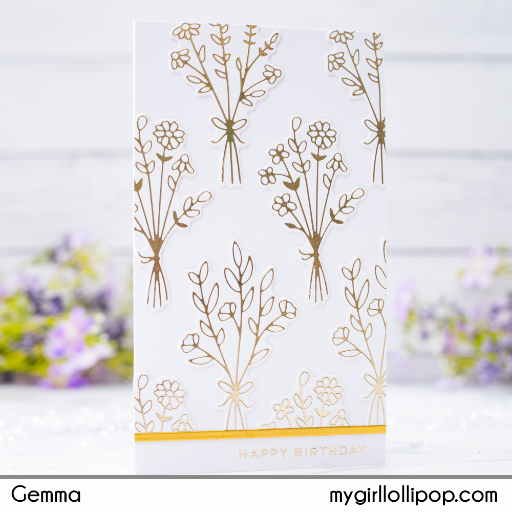 Next, I adhered the bouquets of foiled flowers to fill the panel of card. I then adhered the panel to a mini slimline card base to finish.