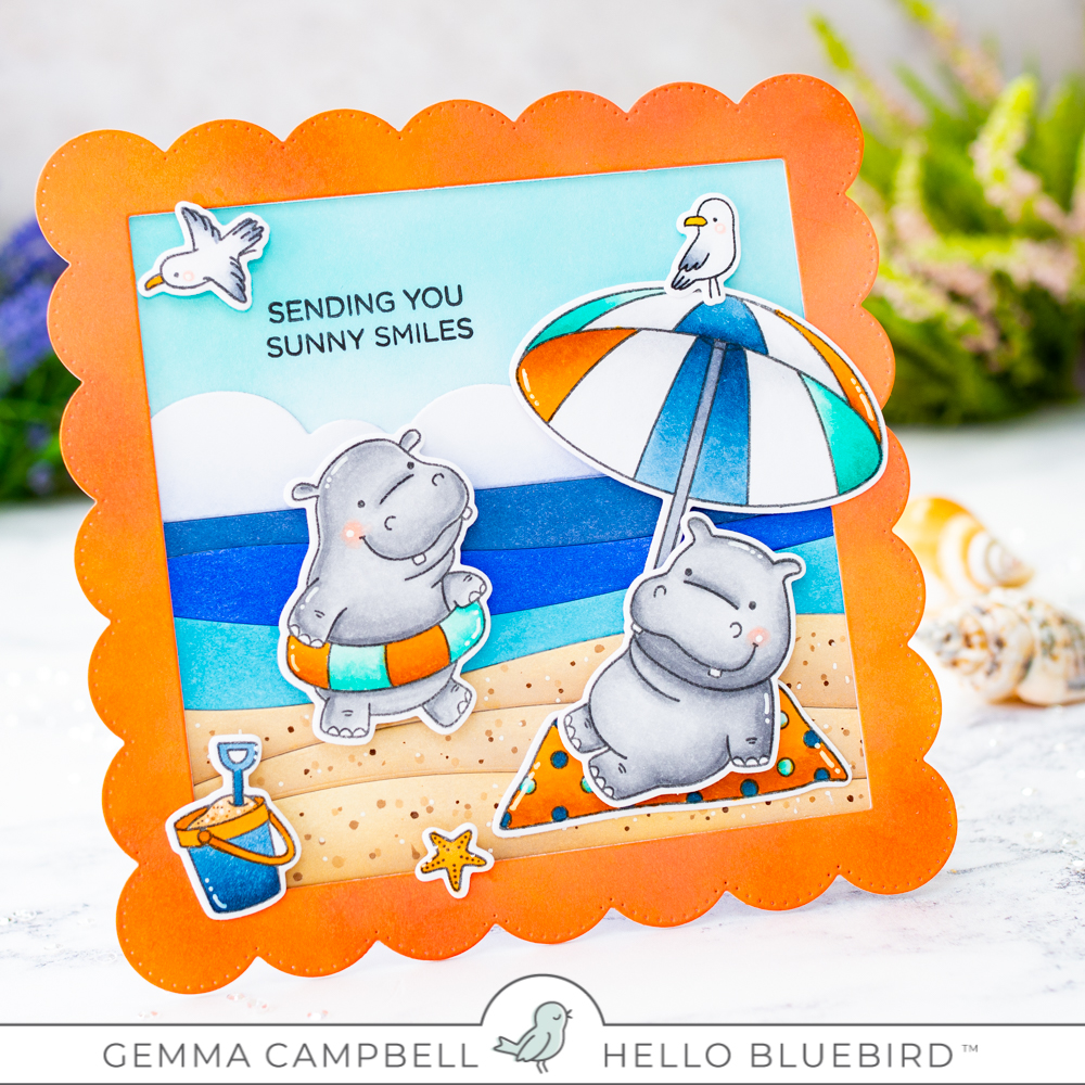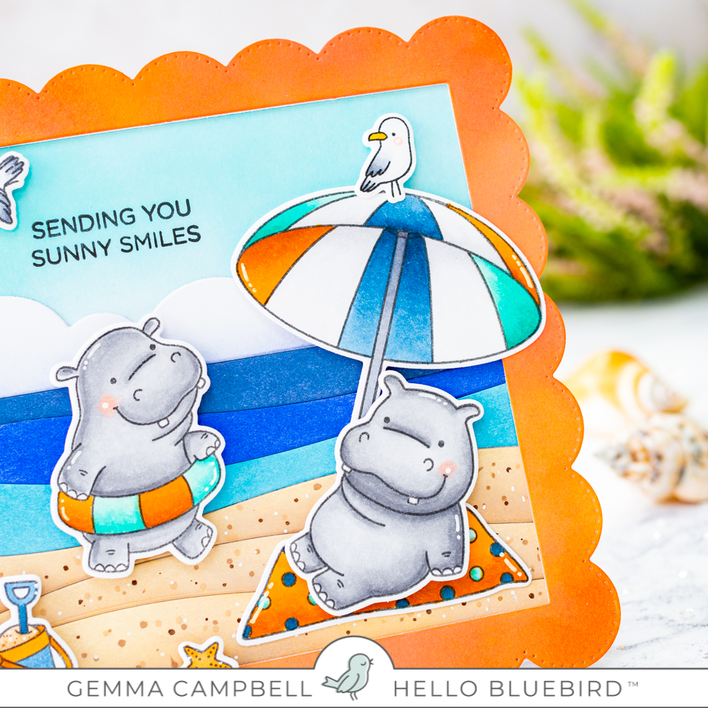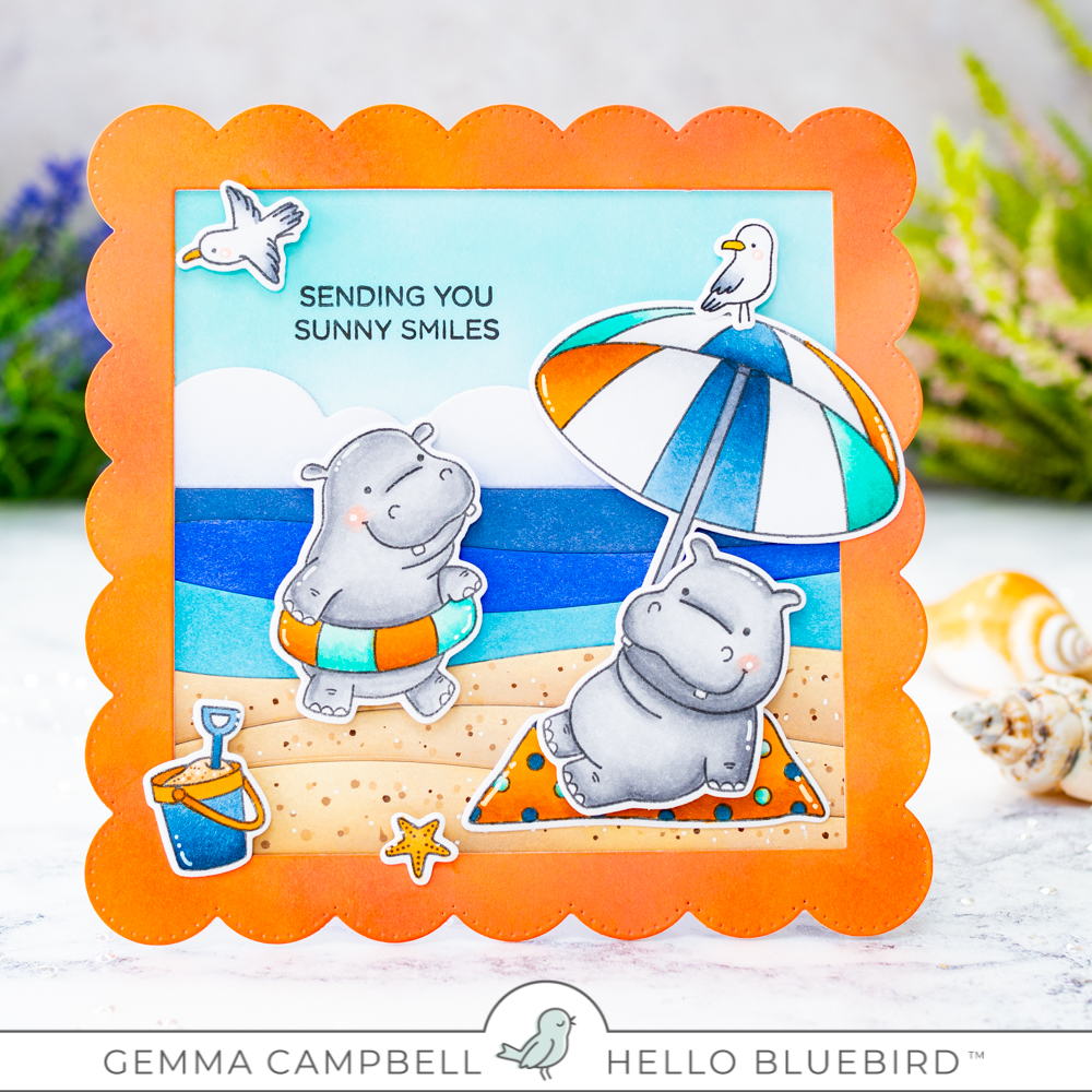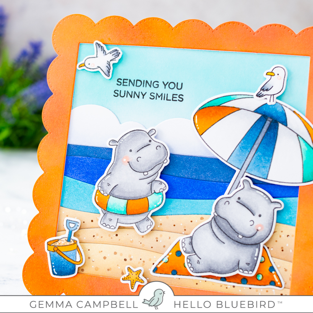 I’m sharing a card today inspired by the June colour challenge from Hello Bluebird. I think these colours are perfect for a warm summer beach scene, so I chose an old favourite- Hippos on Holiday.