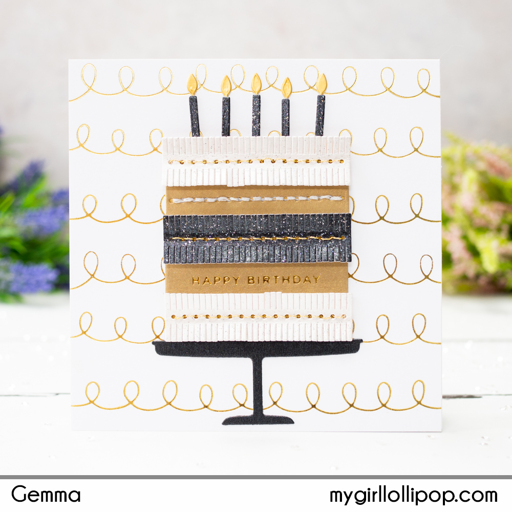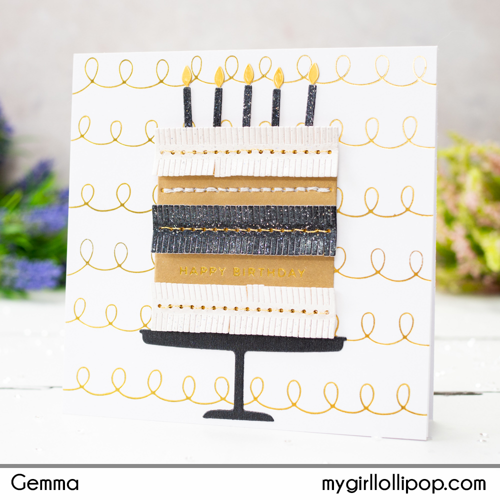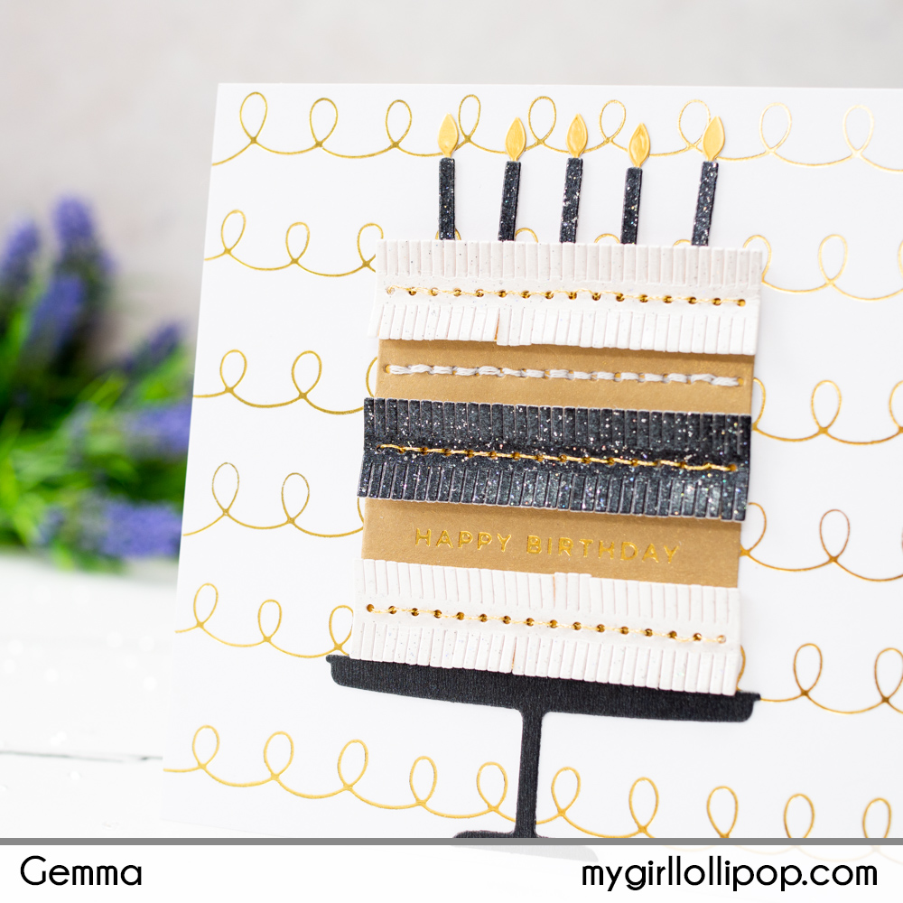 I adhered the foiled background to a card base, then added the cake layers and candles on top to finish.