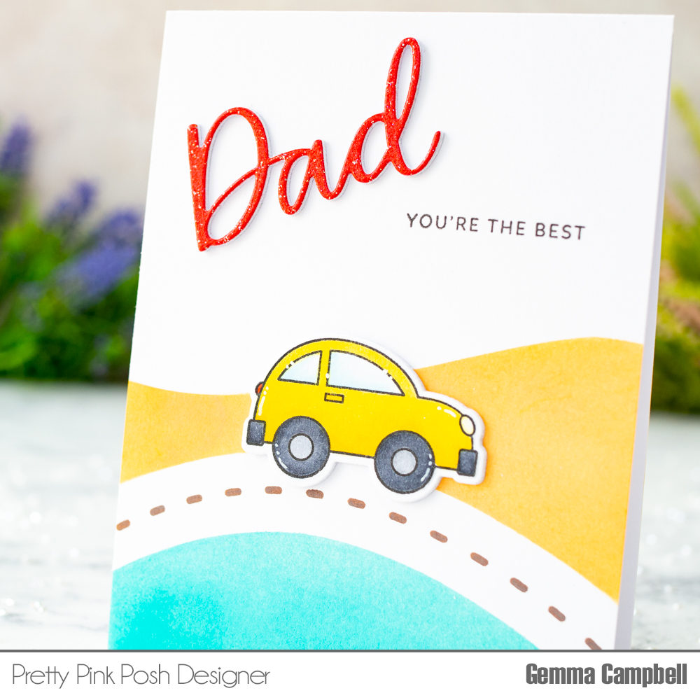 I stamped a car from the Across the Miles stamp set and coloured with copic markers, then used the coordinating die to cut it out. A couple of die cut layers behind add dimension.