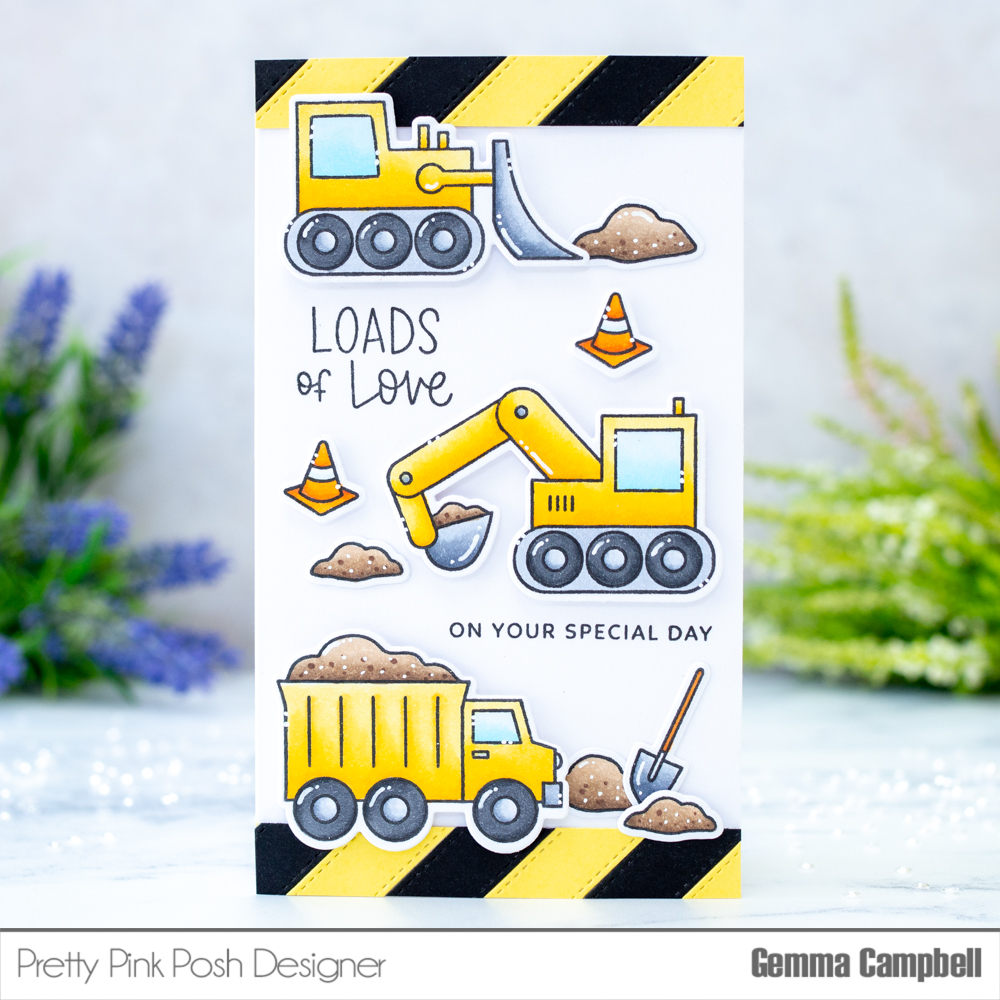 Today I’m sharing a birthday card created with the new and popular Construction Trucks stamp set from Pretty Pink Posh.