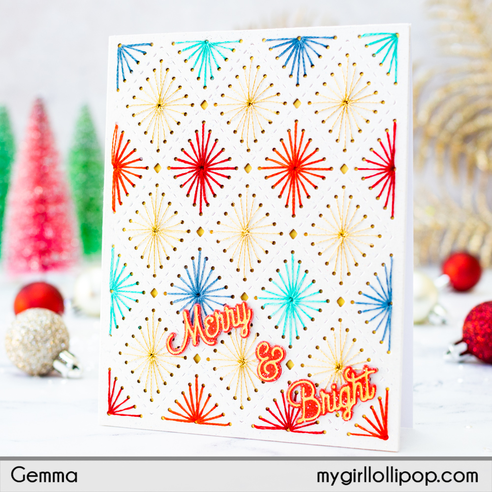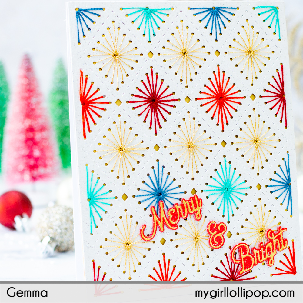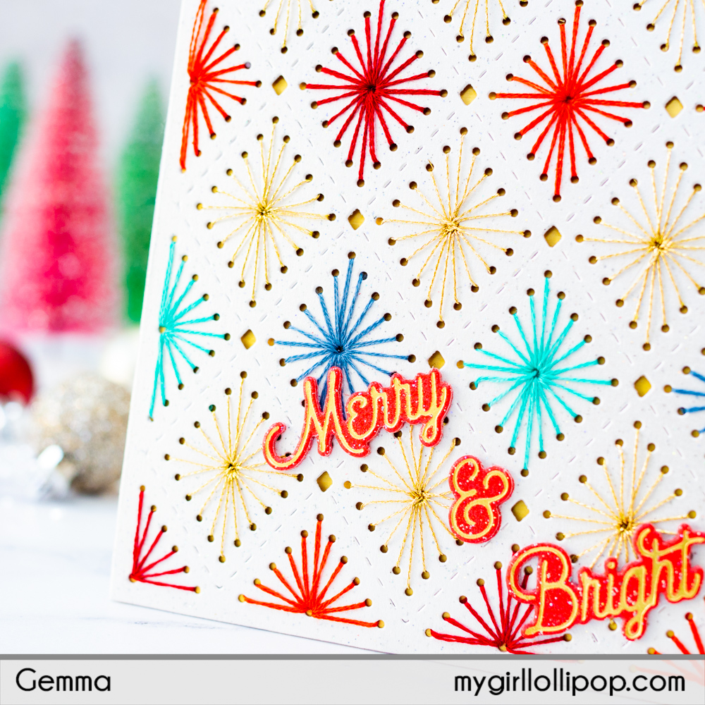 I used different colours of embroidery thread, along with some gold sparkle thread, to add the stitching detail to the background. The die cut panel also looks beautiful without stitching, if you prefer.
