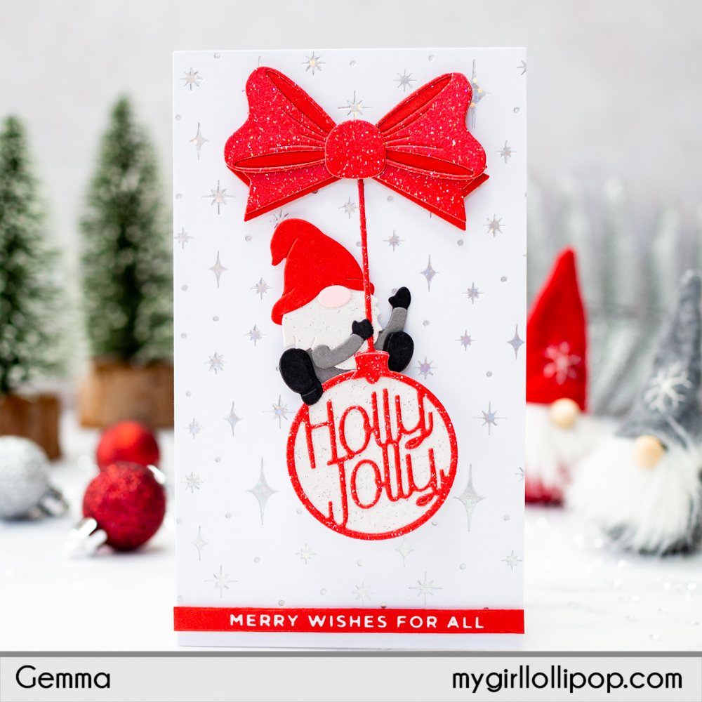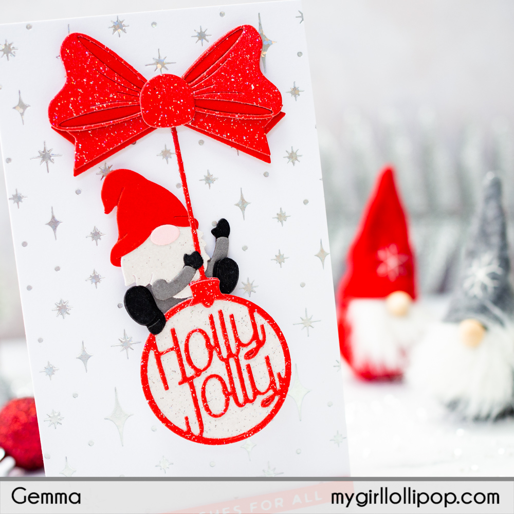 I then adhered the other pieces of the Holly Jolly Gnome die set onto the card. The ornament and gnome have foam tape behind but I covered the sticky backing so they can move. The large bow is adhered using foam tape and covers the pendulum mechanism nicely.