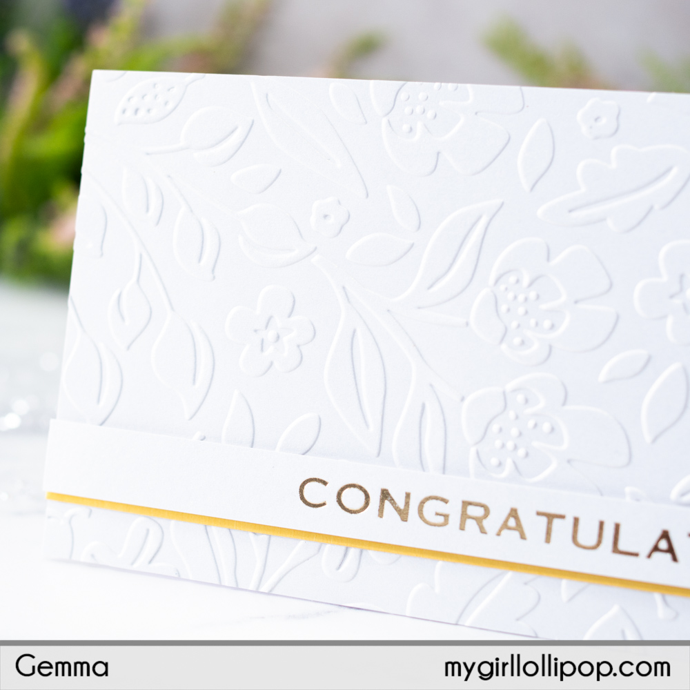 I used the large floral hot foil plate in the set to foil on pearl white card, using Champagne foil. I foiled the plate twice, die cut with the coordinating die, then layered them together to create a diamond frame.