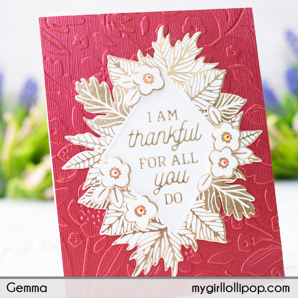 I added some foiled flowers and leaves, using hot foil plates and dies from the September club kit. I then finished with some raspberry jewels in the centres of the flowers.