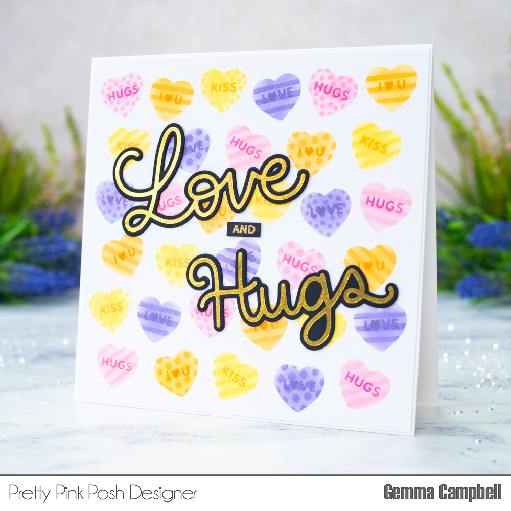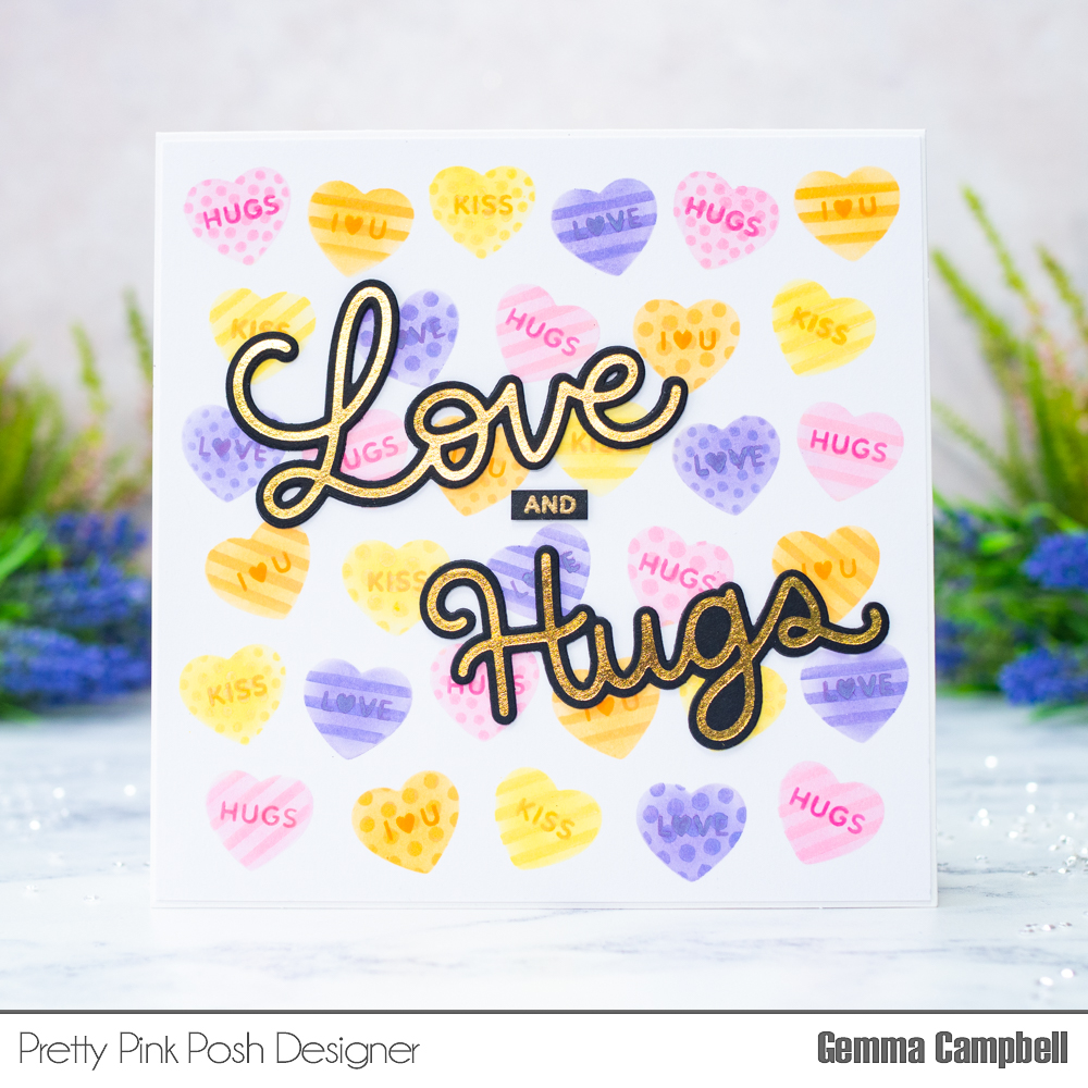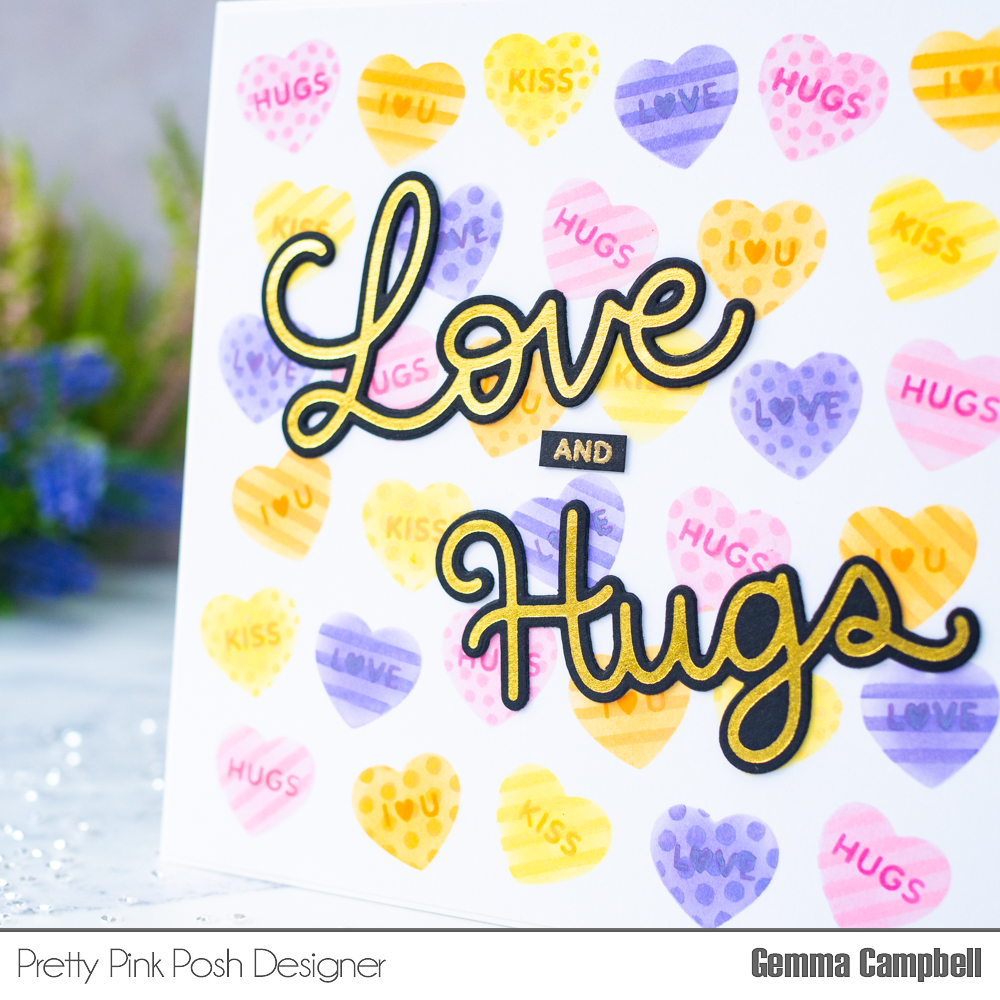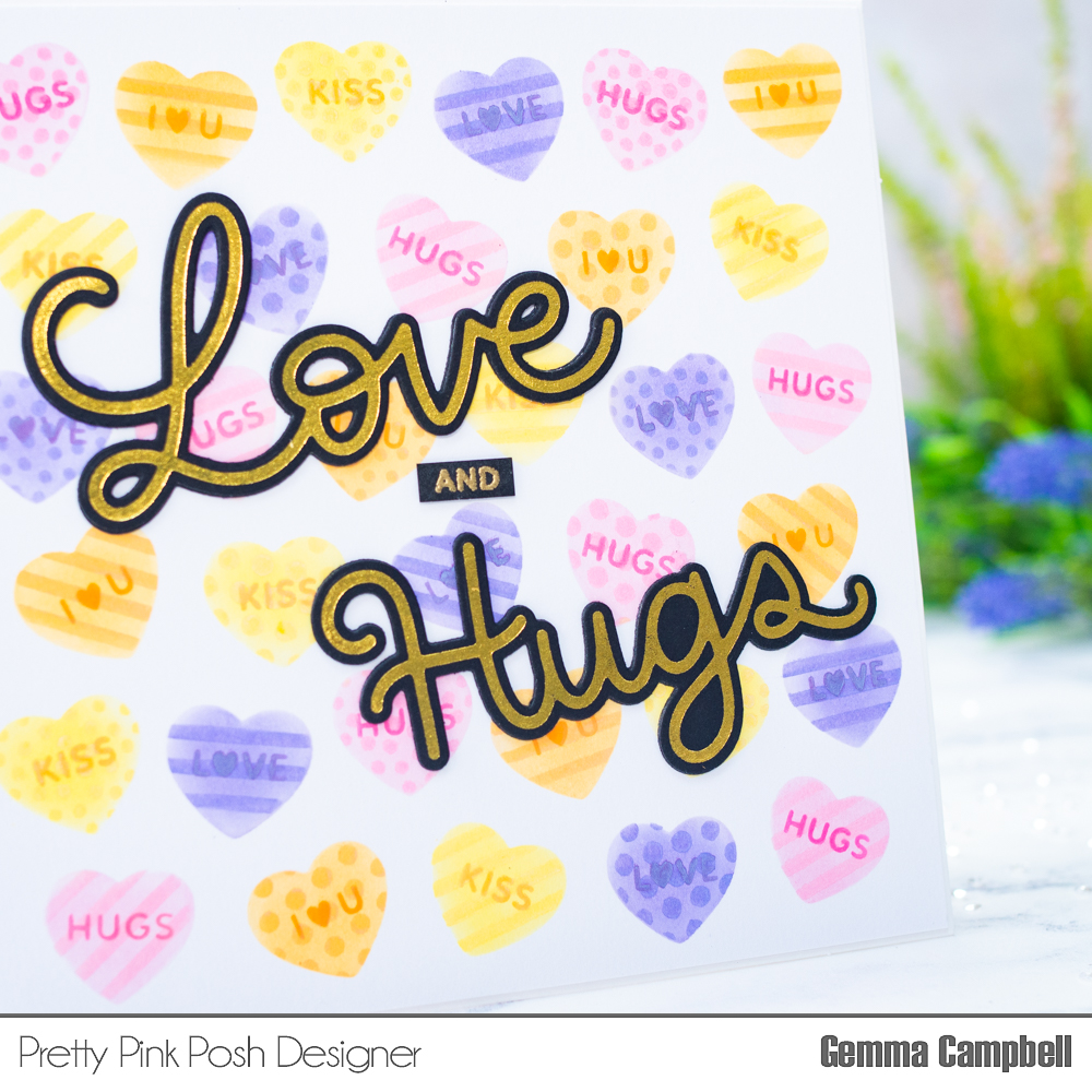I’m really pleased to see coordinating dies for these foil plates too. The Large Love and Large Hugs Shadow die sets each come with a die that can cut out the foiled sentiments. I added extra layers behind each for dimension.