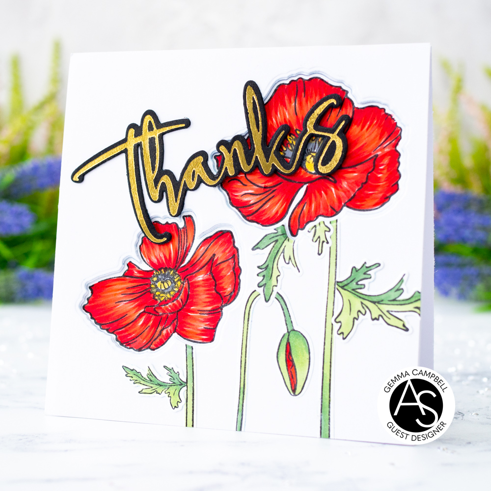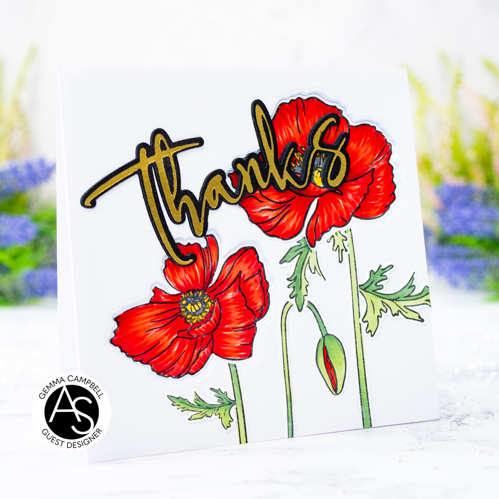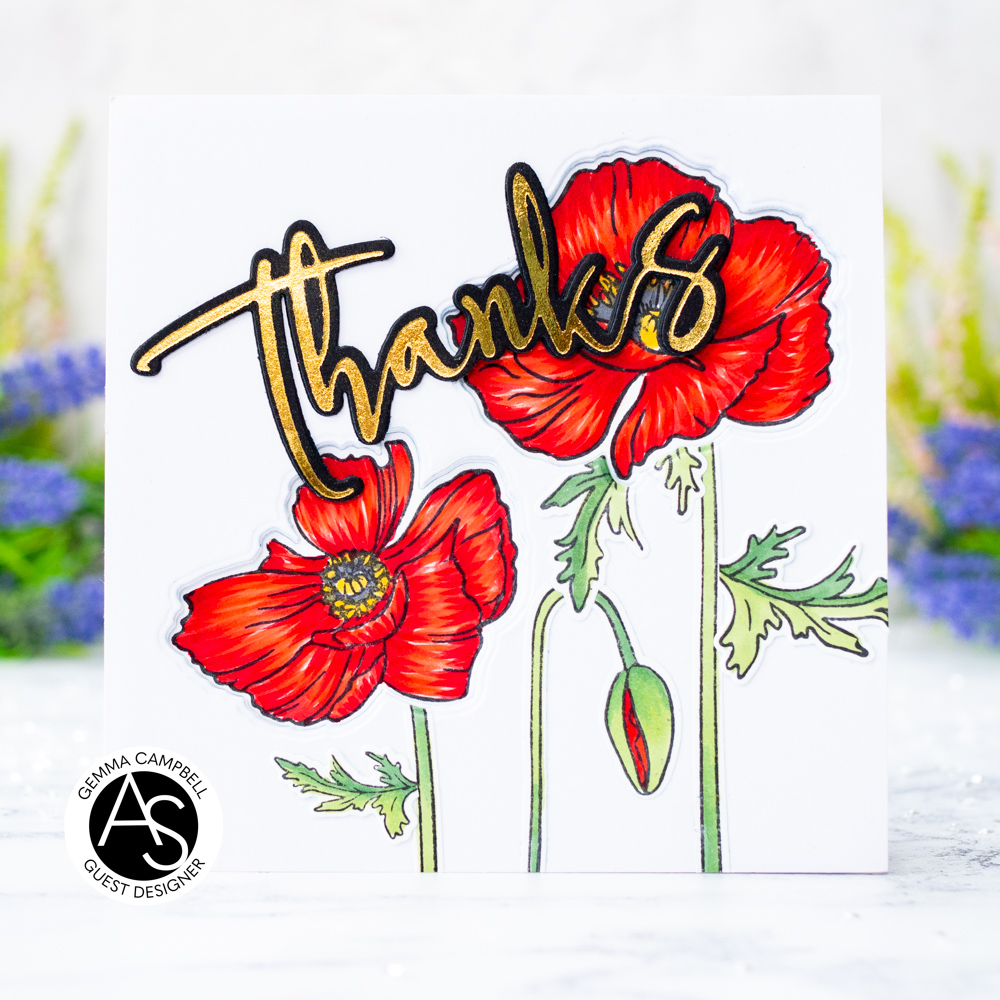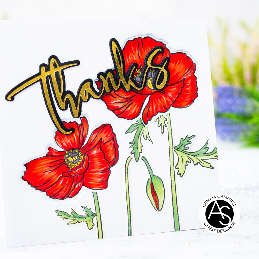 My card features the new Cindy Lou’s Poppies stamp set and the Large Thanks Hot Foil Plate.