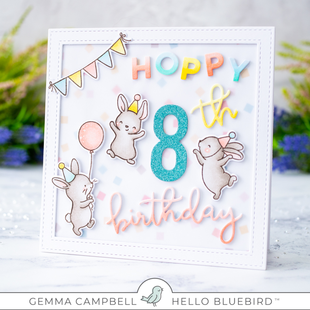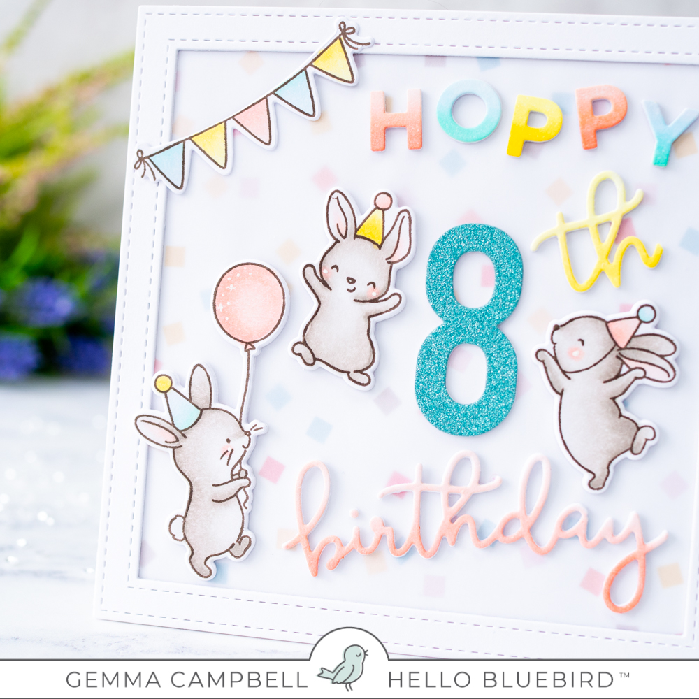 Today I’m sharing a Hoppy 8th Birthday card, featuring sweet bunnies from the Hello Bluebird Oh Happy Day and Cake Time stamp sets.