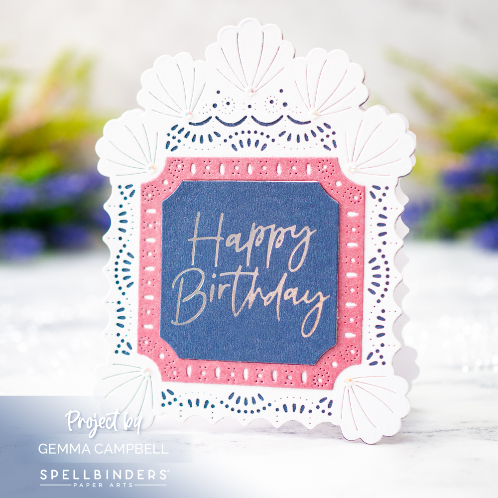 I die cut additional panels, using dies from the set, to add a pearlescent pink border and a pearlescent navy blue centre for a sentiment.