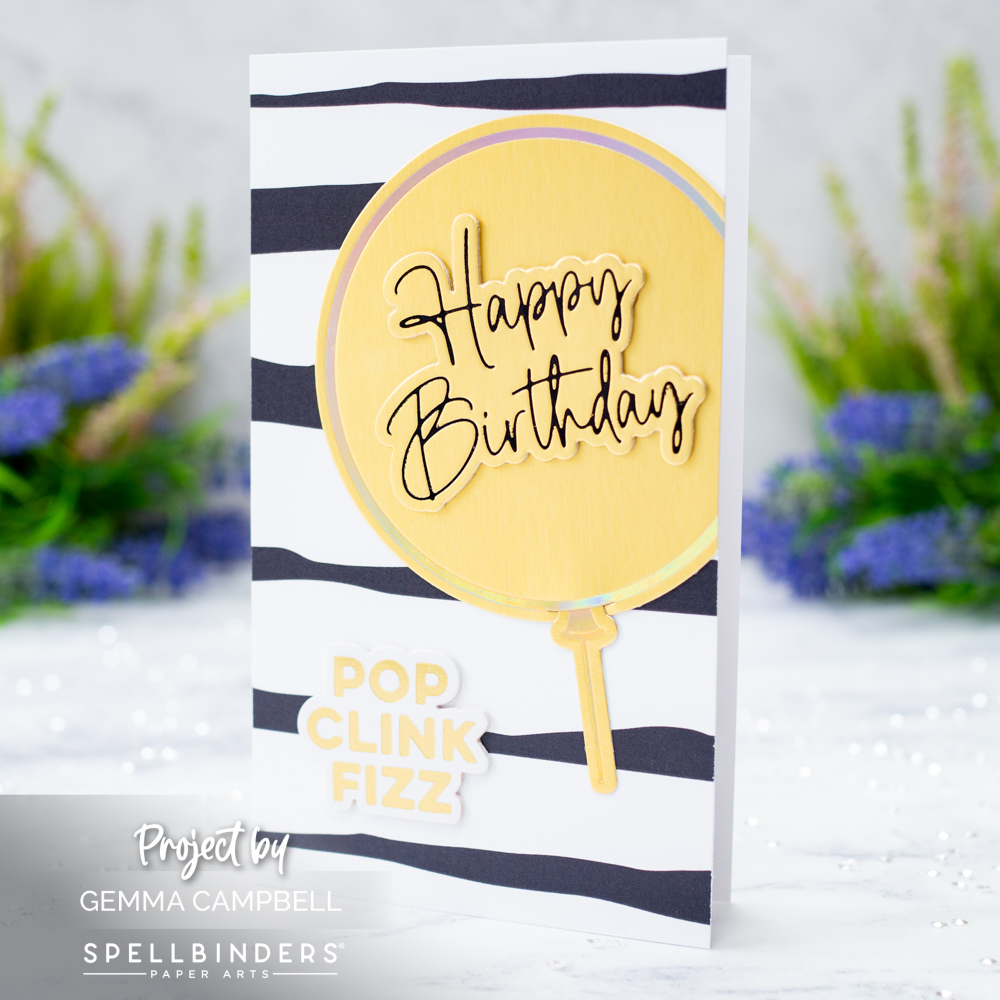 On a slimline card base (3.5 x 6″), I adhered a piece of stripy patterned paper. I then offset the giant balloon slightly off the right edge, trimming away anything overhanging.