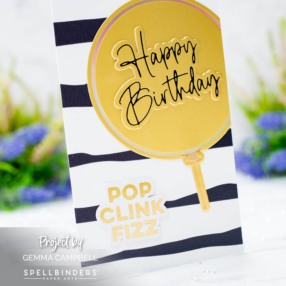 For my first card, I used the Giant Party Balloon glimmer set. Using Aura foil, I foiled the large balloon and string on gold satin mirror card stock.