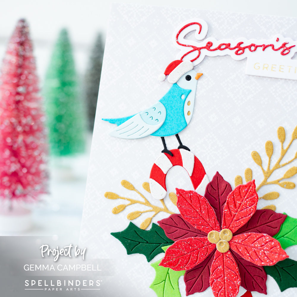 I’m using the Christmas Bird Poinsettia die set, along with the Christmas Die & Glimmer Sentiments set on my card today.