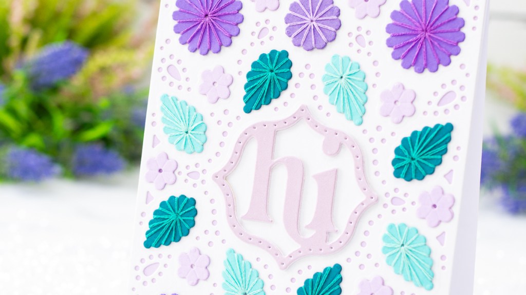 I die cut the cover die from a pearl white card stock. I used Papermill Direct turquoise and purple card stock for the leaves and flowers.