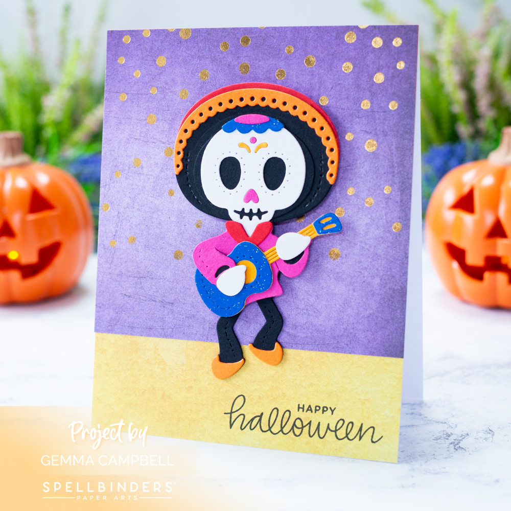 I’m using the Dancin’ Grim and Dancin’ Boy Day of the Dead sets on my cards today. These fun interactive die sets have moving parts and are simple to put together.