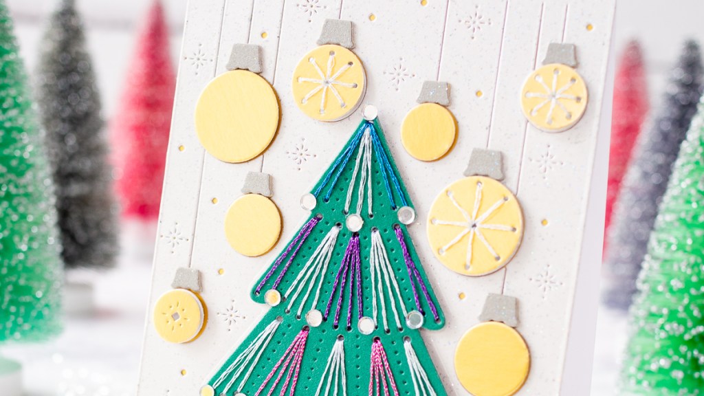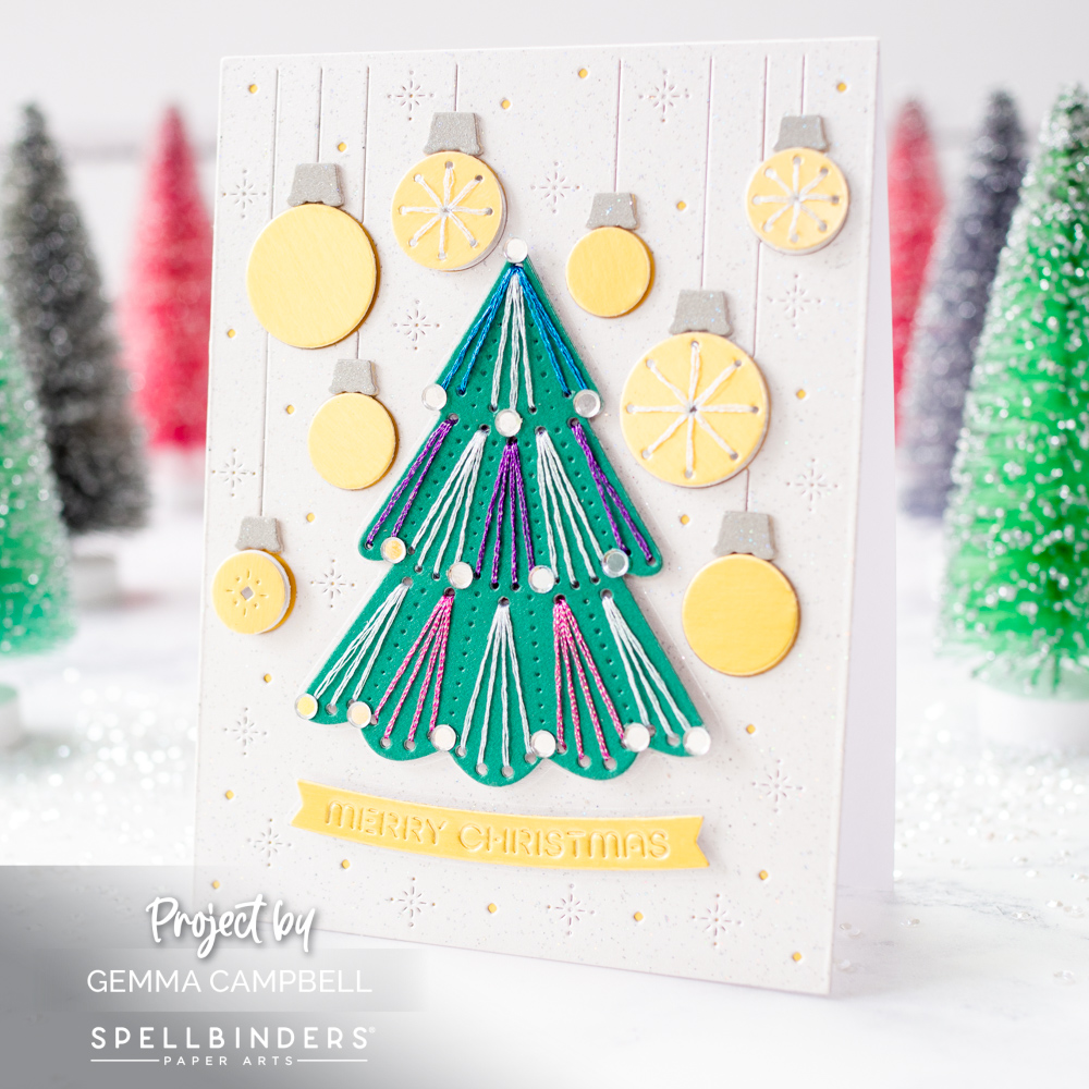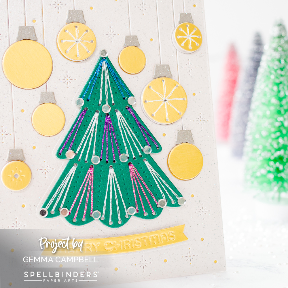 I die cut the main panel from pearl white sparkle card, the tree from a pearl green card, and the baubles and sentiment from satin gold mirror card. There are additional sentiment options in the set.