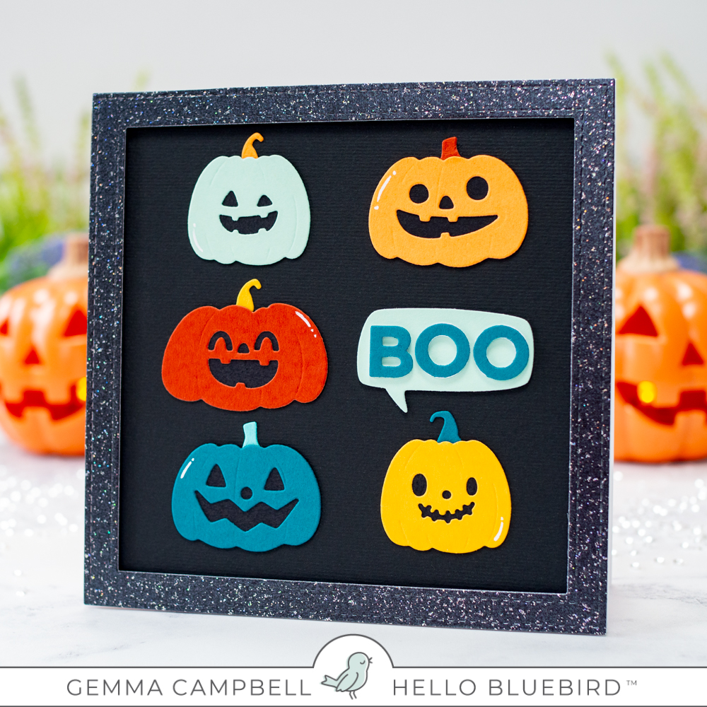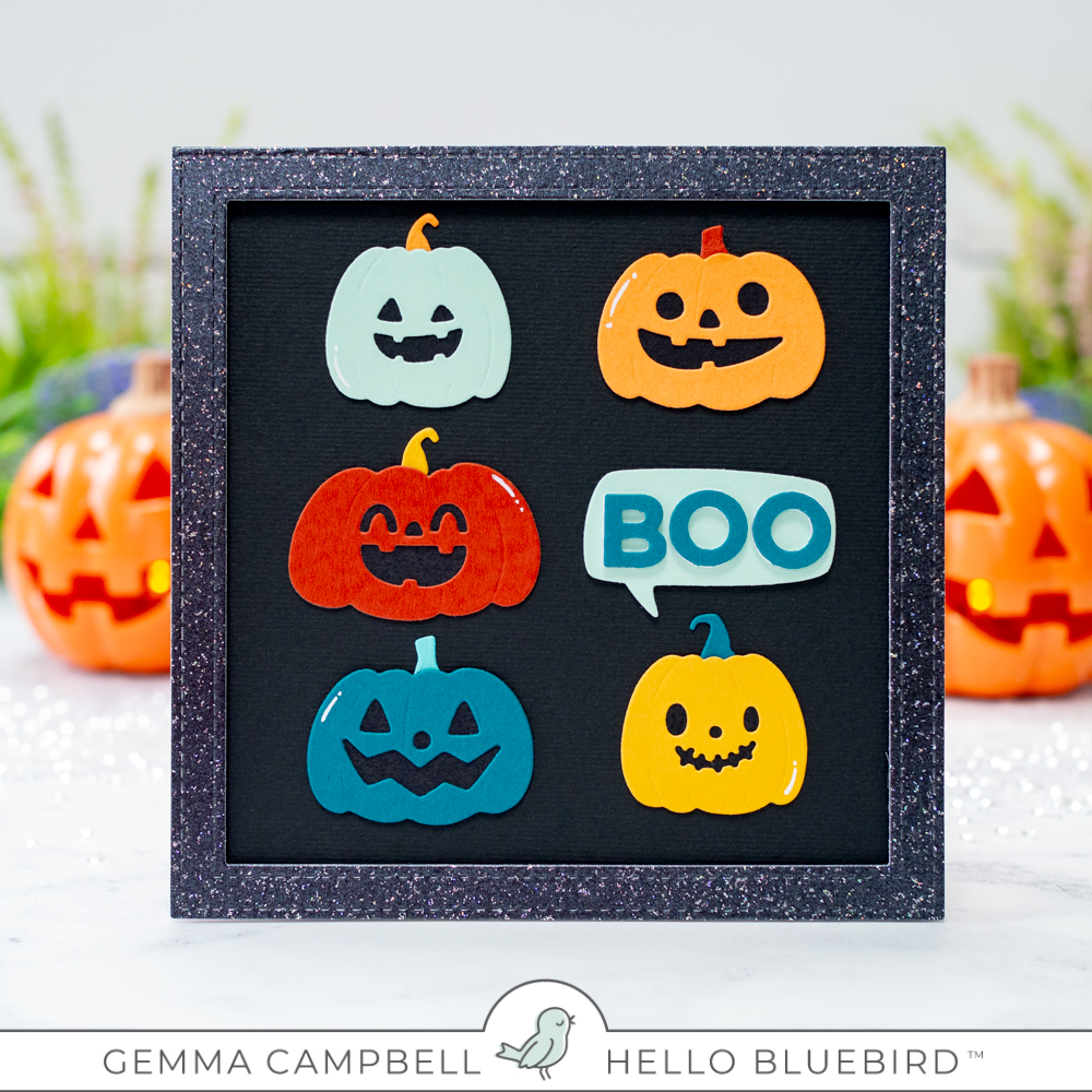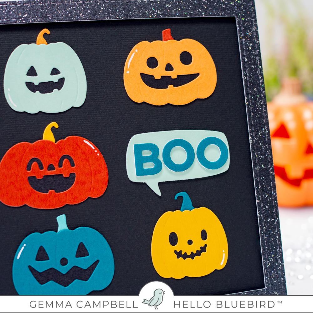 I arranged the pumpkins on my card, leaving a space for my sentiment. For the sentiment, I die cut one of the Word Bubbles from blue card. I then die cut the word ‘boo’ using the Jane Small Alpha die set. The letters have two extra layers behind for dimension.