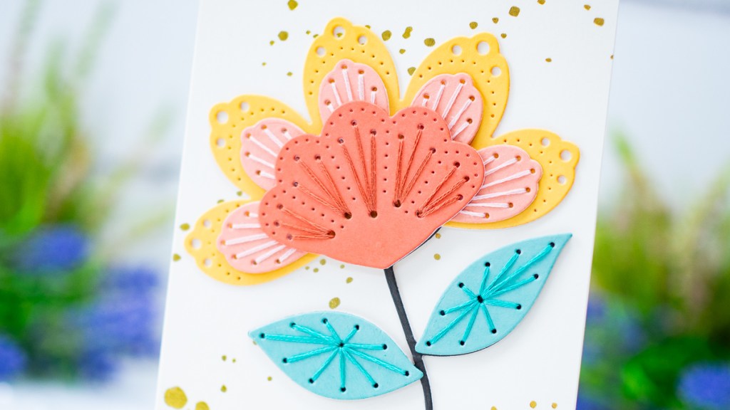 On a piece of ivory card, I added some gold foiled details using a previously released Spellbinders glimmer set. I adhered this to an ivory U.K. A6 card base, then added the stitched flower on top.