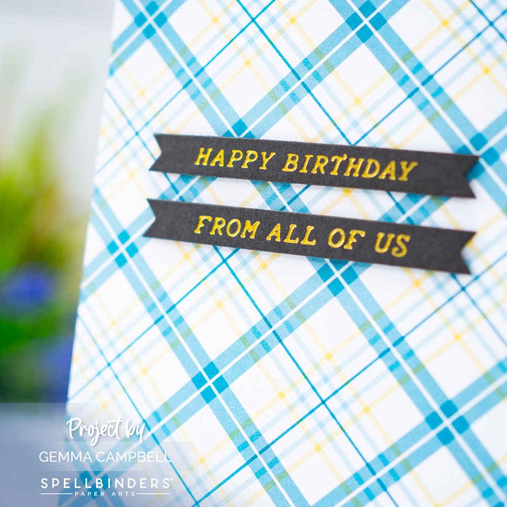 I chose some blue plaid patterned paper and adhered it to my U.K. A6 ivory card base. I then used foam tape to add two of the sentiment strips for a simple masculine birthday card.