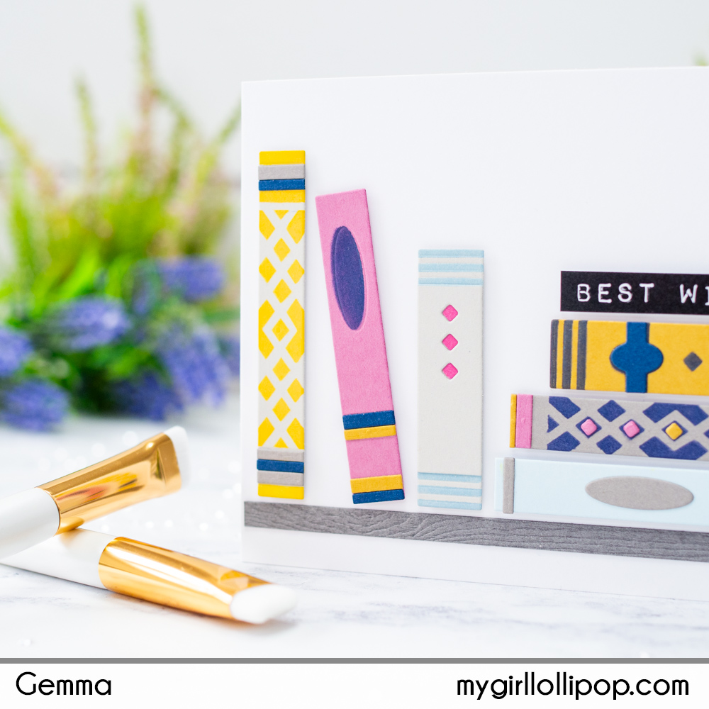I created a card using the Classic Books die set and Layering Stencil. I die cut some of books in the Classic Books die set from different colours of C&9th card.
