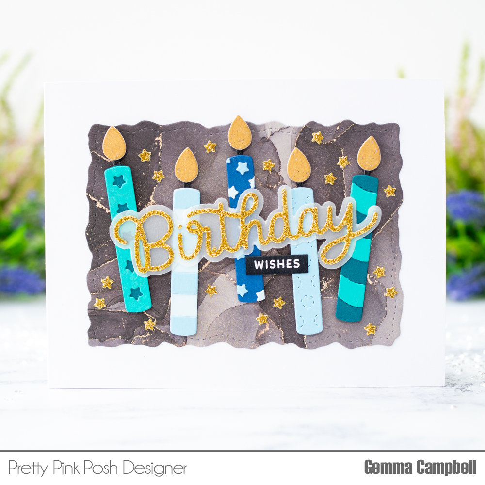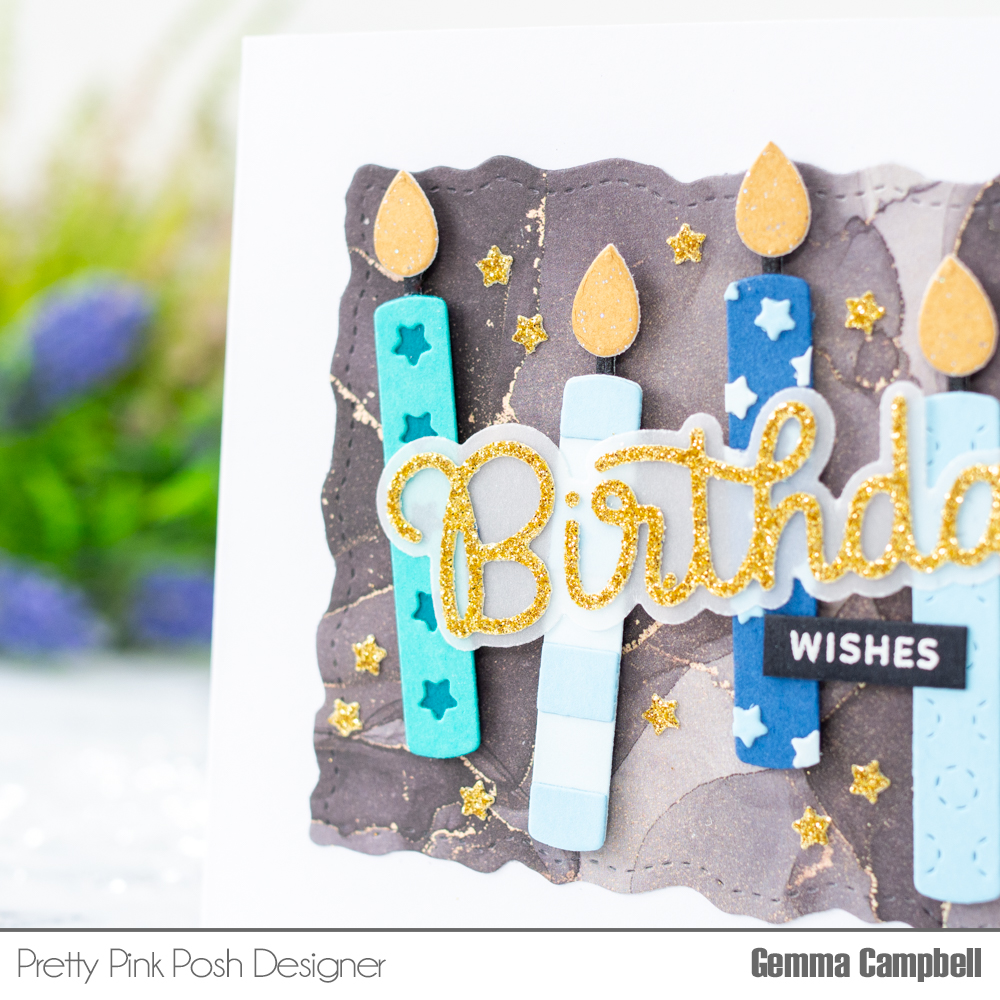 To add some extra sparkle and interest, I added some gold glitter stars around the candles. These are cut using one of the dies in the Birthday Candles die set.