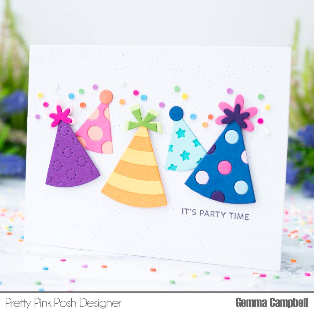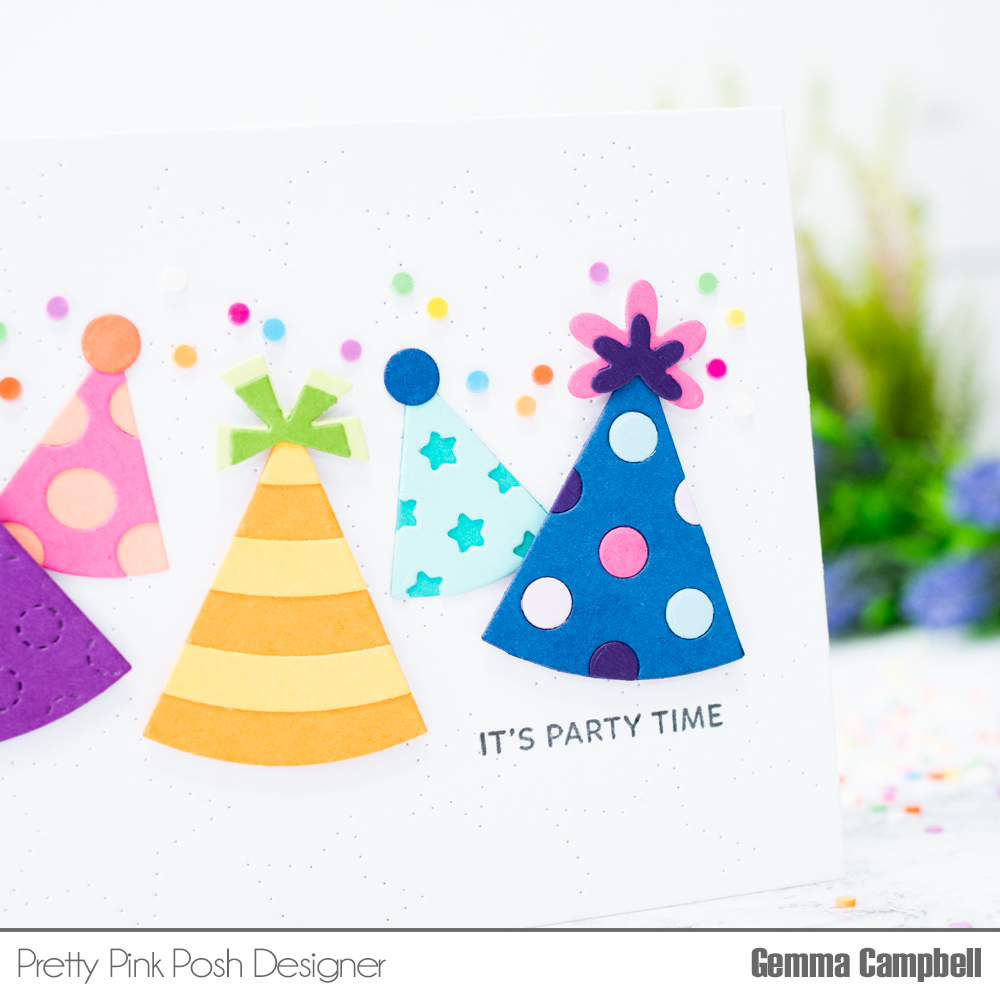 My card features the new Party Hats die set. I love these buildable die sets by Pretty Pink Posh, they offer lots of fun possibilities for different looks and colours.