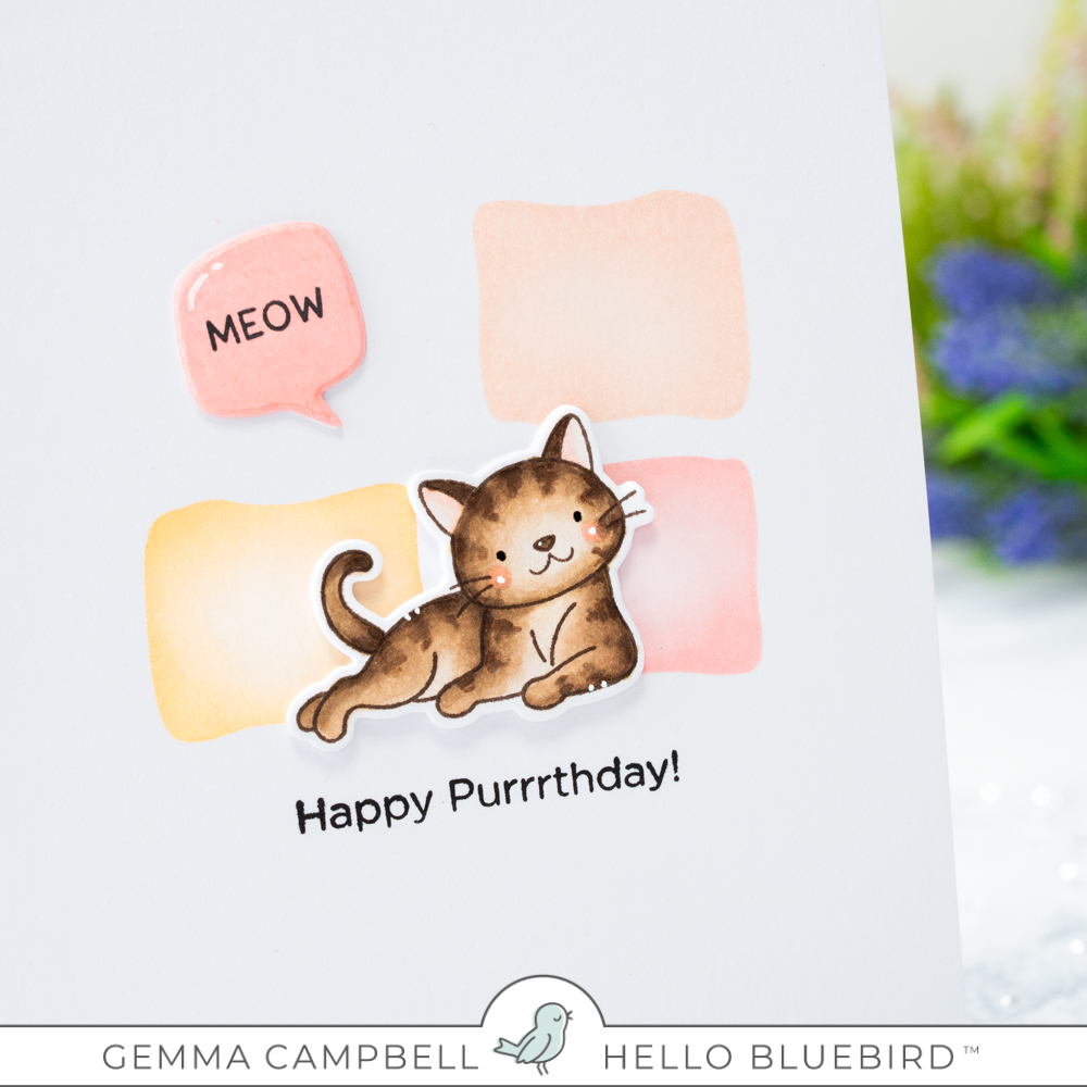 Both sentiments are also from the Nine Lives set. I die cut a Hello Bluebird Word Bubble from white card, then blended on Saltwater Taffy distress oxide ink to match the card colours.