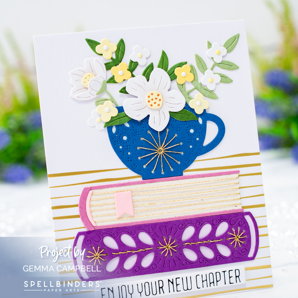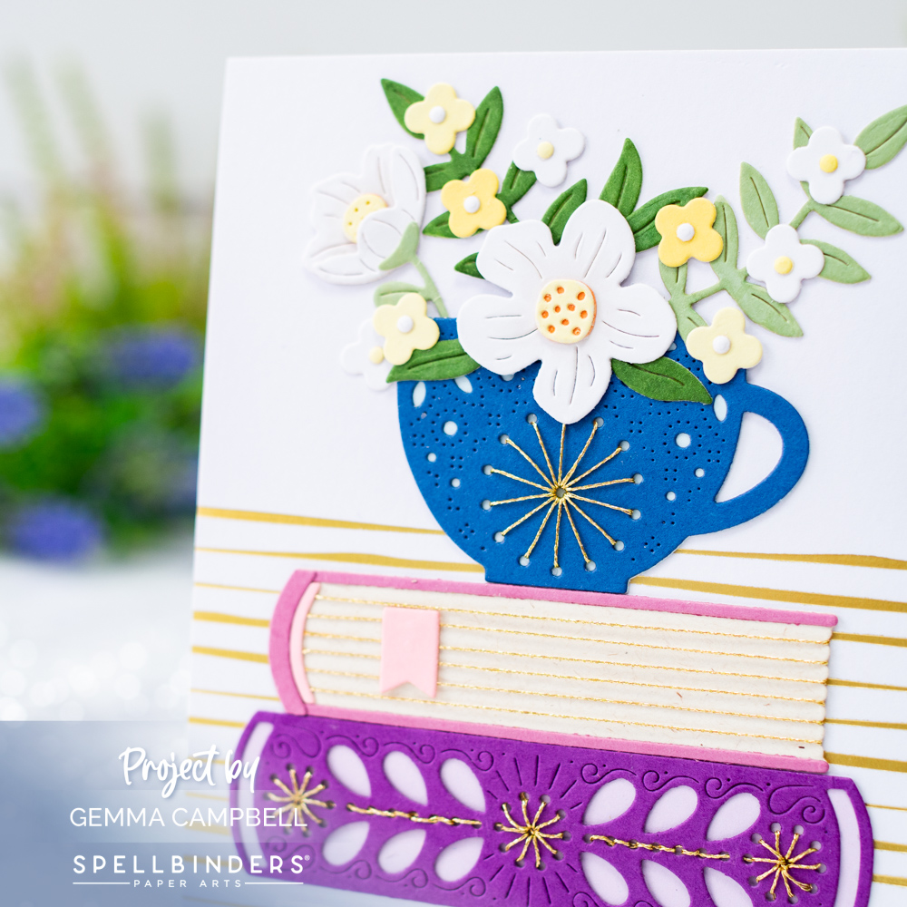 I die cut the two books and the coffee cup, then added some metallic gold stitching details. I love the look of the book with the gold pages and bookmark.