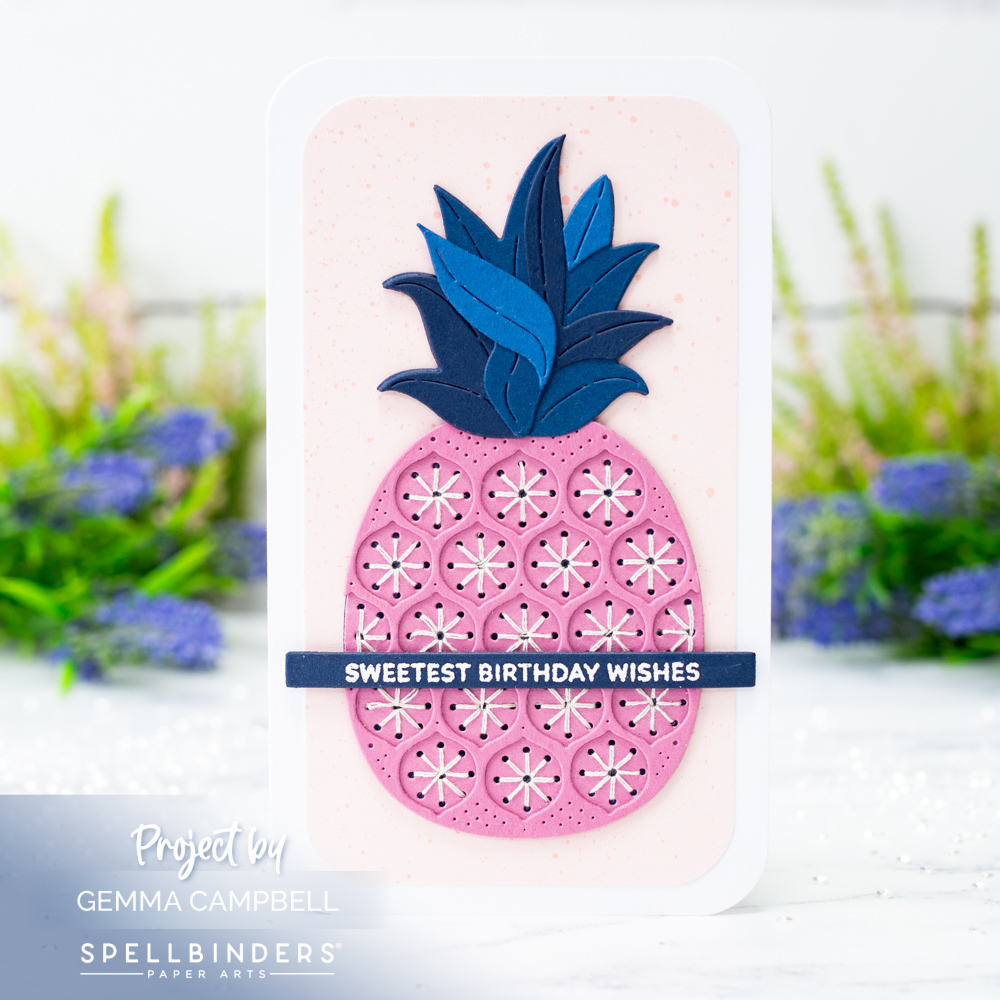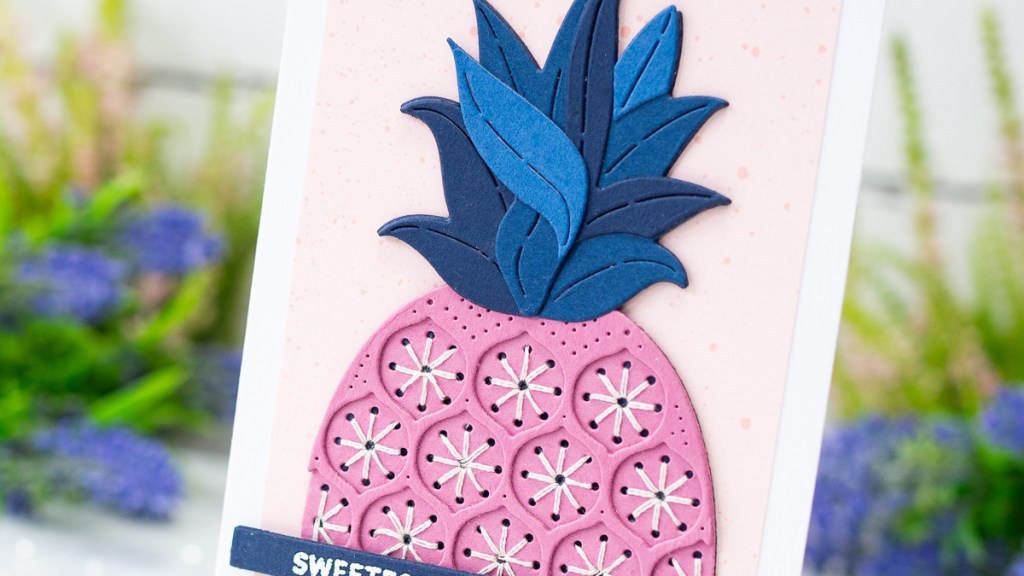 The card base is a mini slimline with rounded corners. The base is 6” high and gives an idea of the pineapple size.