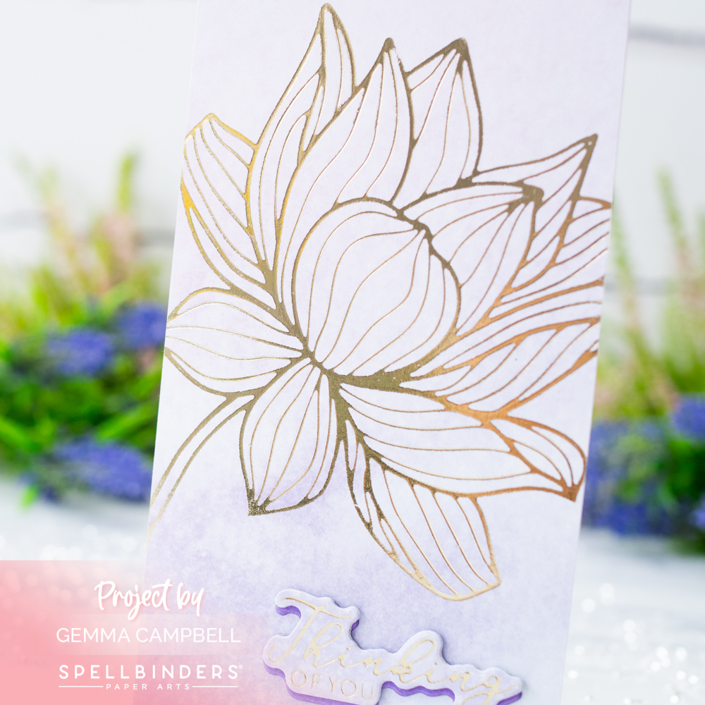 I embossed the large flower with champagne foil over a panel of purple patterned paper.